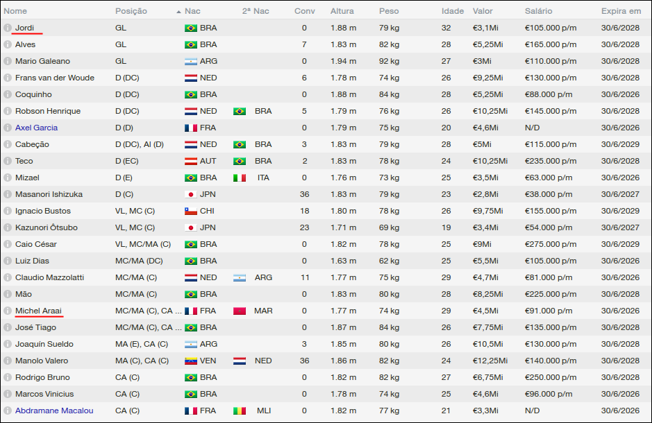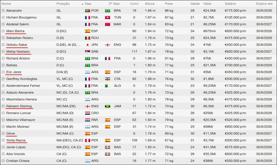 O elencos do adversários (jogadores reais sublinhados em vermelho):