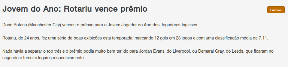 As boas notícias ficaram por conta dos nossos ilustres jogadores que foram premiados nas mais diversas categorias da Premier League: melhor jogador do ano, revelação do ano e time do ano. Outra informação boa para o save foi a renovação exigida por mim quando a temporada caminhava para o final já que eu via meu cargo em perigo e que, por sorte, foi aceita pela diretoria.
