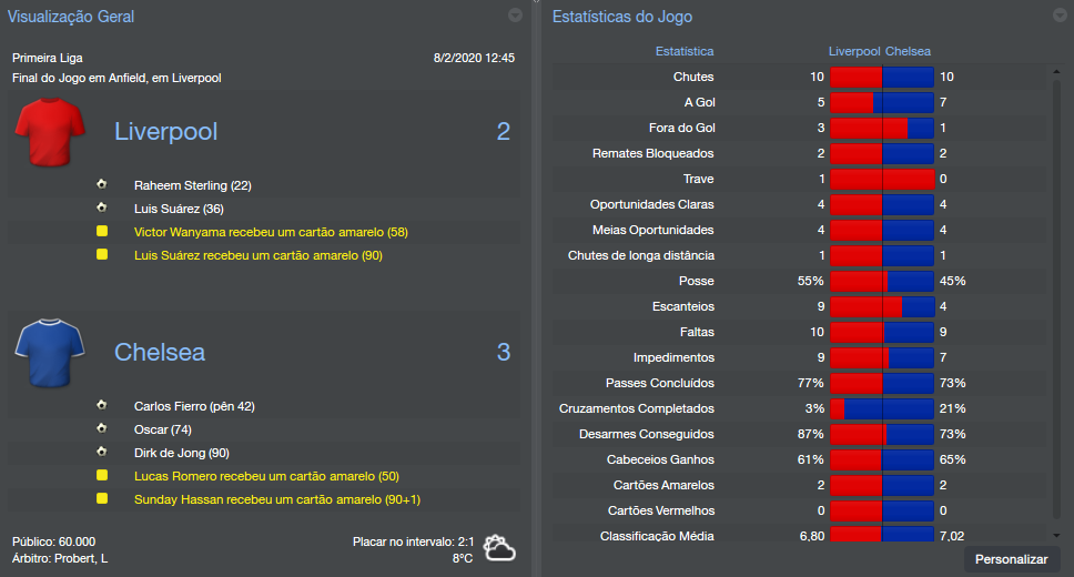 Fora de casa não conseguimos impor o mesmo padrão de jogo, tarefa sempre difícil, e perdemos feio para o Chelsea além de ceder um empate, mais uma vez, para o West Brom. Com todos esses resultados (13 jogos: 6 vitórias; 2 empates; 5 derrotas) não conseguimos chegar no topo da tabela, meta que estabeleci com a direção no início da temporada, o que me fez balançar no cargo e estimular a desconfiança dos jogadores à cerca do nosso trabalho. Por sorte as três vitórias nos últimos três jogos deram uma aliviada na pressão sobre mim e sobre os atletas.