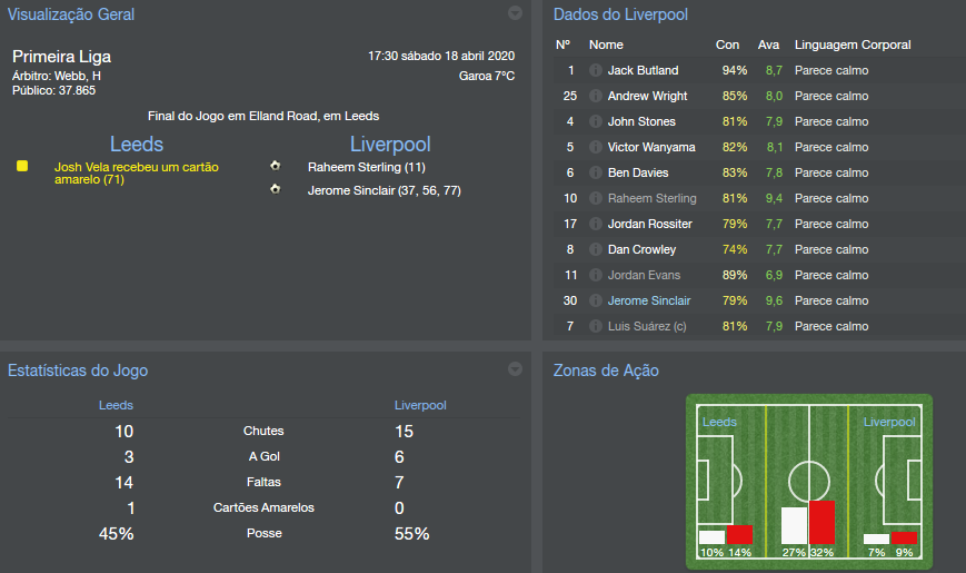 No segundo jogo com Sinclair machucado e Cleaver voltando de lesão, tive que apostar em Norris para fazer o par com Luis Suárez. Sem Rossiter, suspenso, me obriguei a ser mais ofensivo e escalei Ward-Prowse junto com Henderson na faixa central da meia-cancha. O resto do time era o titular, com exceção da saída de Wanyama, suspenso pelo segundo amarelo: Butland, Flanagan, Stones, Souttar e Ben Davies; Sterling, Henderson, Ward-Prowse e Jordan Evans; Norris e Suárez.
