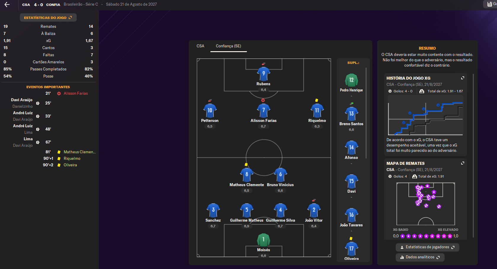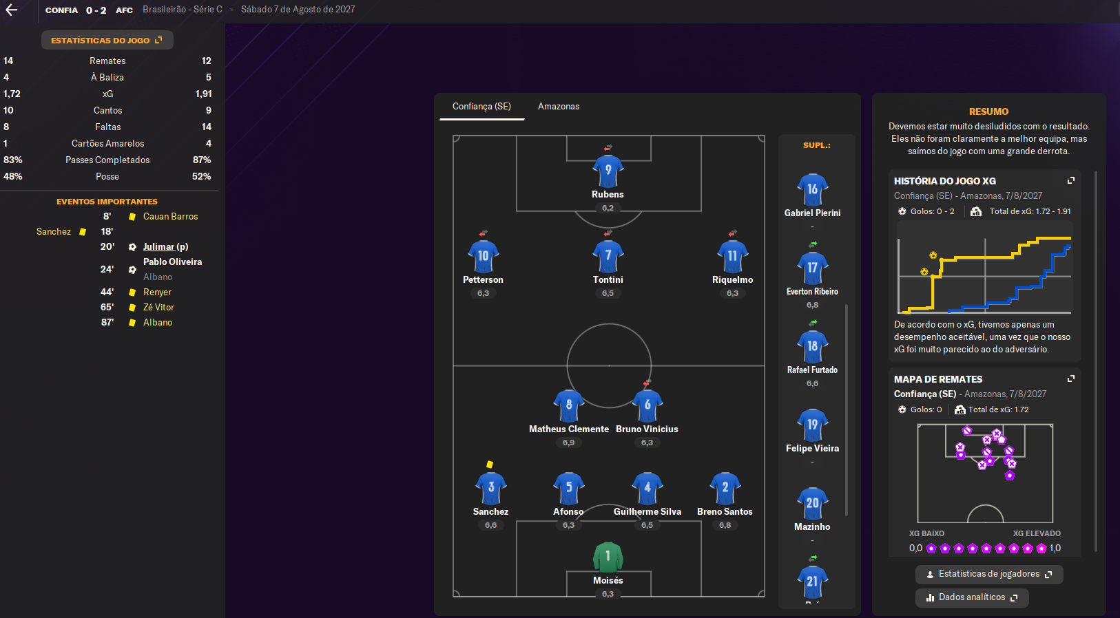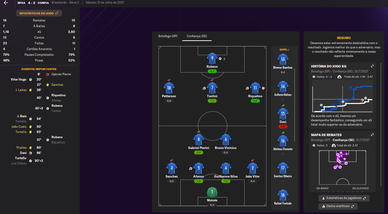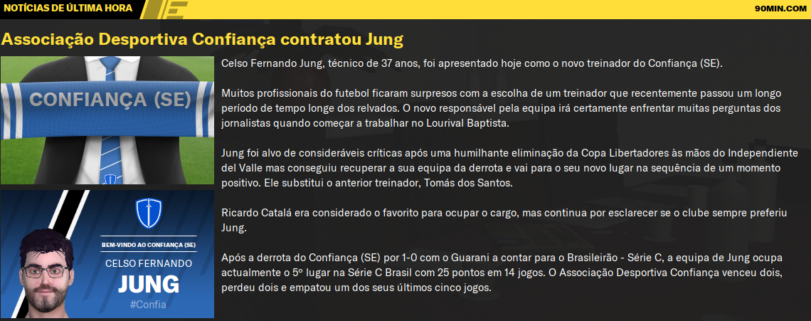 F J Postado 20 de Julho Denunciar Postado 20 de Julho Sem vitórias nos despedimos do Confiança. Na sequencia entregamos um empate pro União Rondonopolis apos estar vencendo de 3x1, lamentavel Fomos pro jogo da vida contra o CSA nos em 7o eles em 9o fora de casa e levamos uma trolha de 4x0 Ao final da partida foi pedida a demissão apos 33 dias, tinhamos 8 reforços encaminhados por quadrangular mas o time não deu liga O Confiança terminou a 1a fase em 10o, quando cheguei era 5o... Olhei as CAs do time e era bem fraco, o time que eu montei no Figueira na D, não devia muita coisa pra esse Confiança, pessima atuação minha, com os reforços o time ia ficar bem melhor mas era obrigaçao classificar Citar