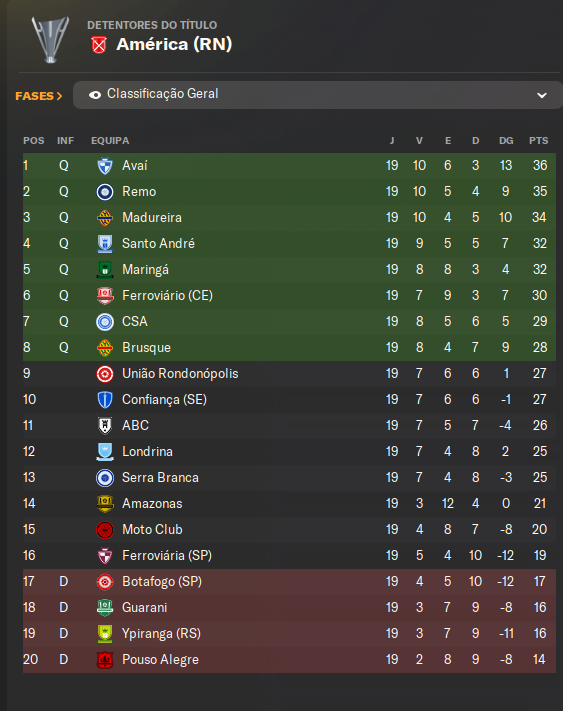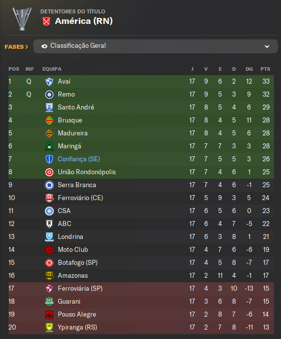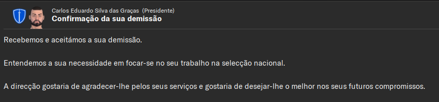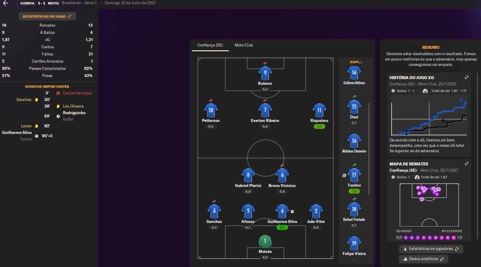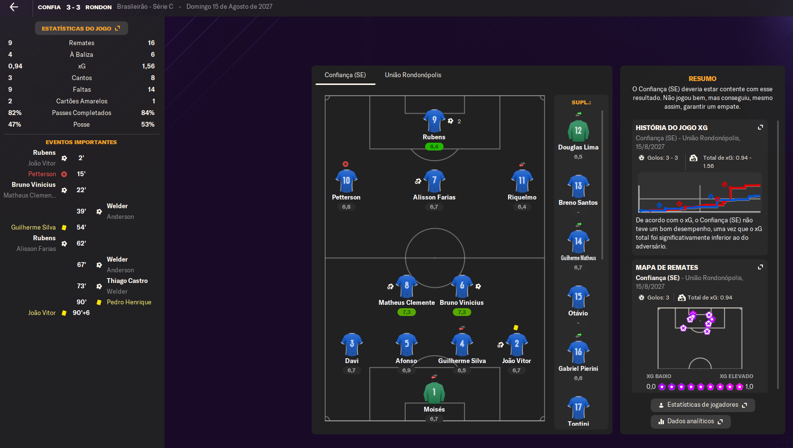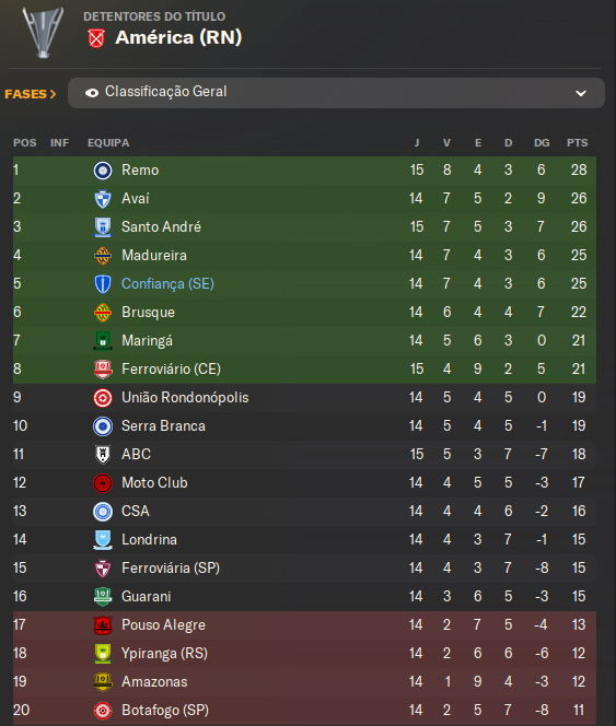 F J Postado 20 de Julho Denunciar Postado 20 de Julho Sem vitórias nos despedimos do Confiança. Na sequencia entregamos um empate pro União Rondonopolis apos estar vencendo de 3x1, lamentavel Fomos pro jogo da vida contra o CSA nos em 7o eles em 9o fora de casa e levamos uma trolha de 4x0 Ao final da partida foi pedida a demissão apos 33 dias, tinhamos 8 reforços encaminhados por quadrangular mas o time não deu liga O Confiança terminou a 1a fase em 10o, quando cheguei era 5o... Olhei as CAs do time e era bem fraco, o time que eu montei no Figueira na D, não devia muita coisa pra esse Confiança, pessima atuação minha, com os reforços o time ia ficar bem melhor mas era obrigaçao classificar Citar