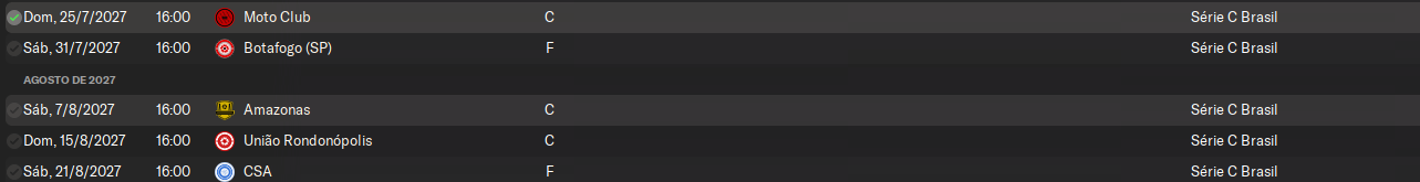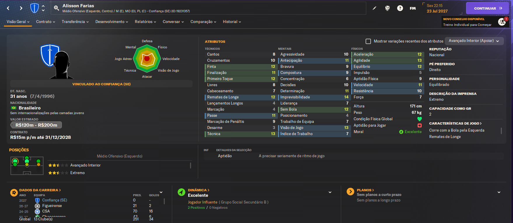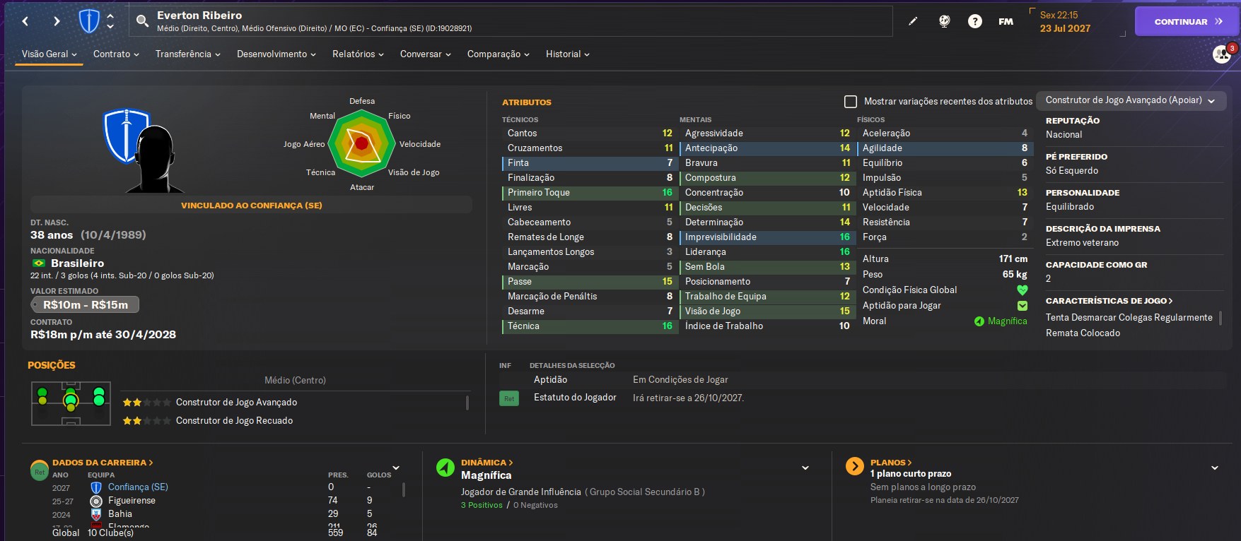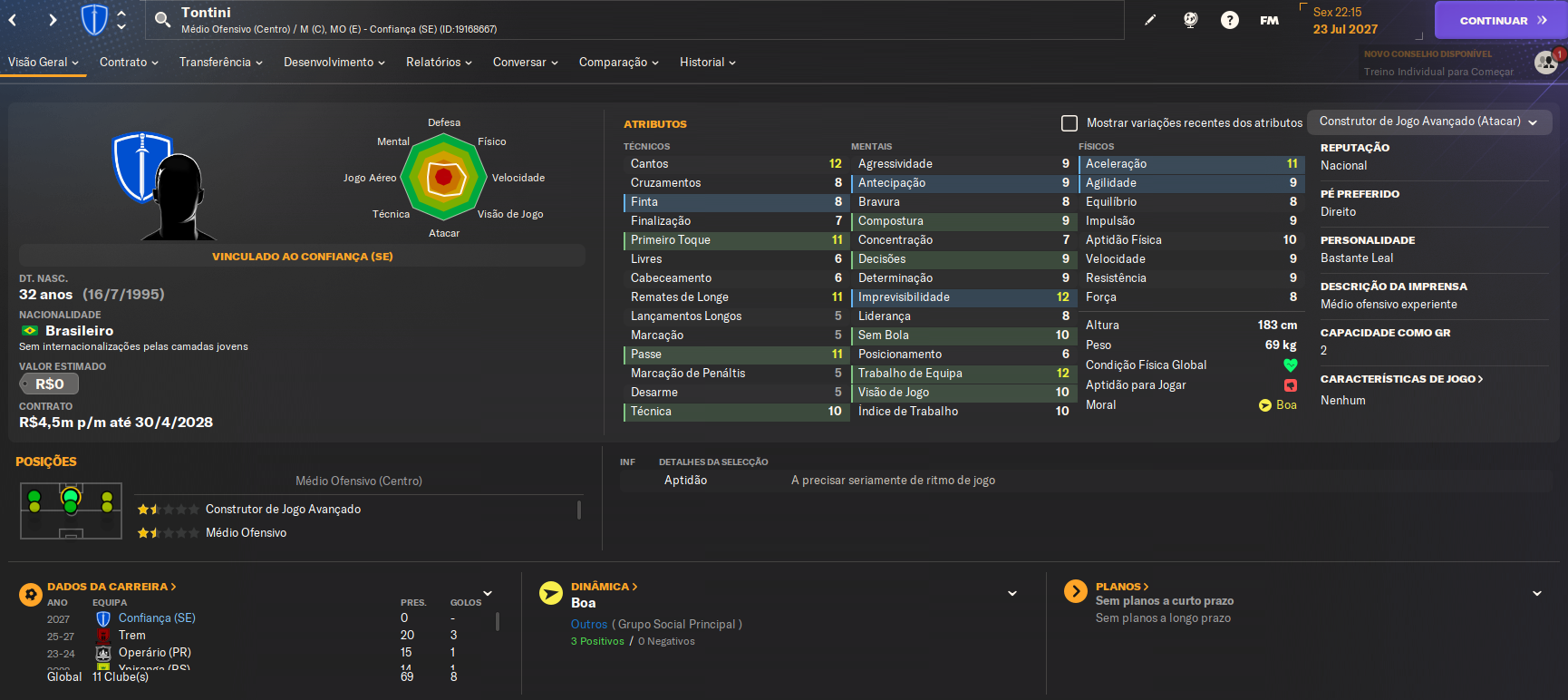 F J Postado 14 de Julho Denunciar Postado 14 de Julho 2 horas atrás, F J disse: Vamos pra mais um freela enquanto o Marrocos não joga: Peguei o time em 5o na C (o tecnico saiu pro Sport, era um newgen...) faltando 5 rodadas, cheguei e o elenco não tinha um meia ofensivo, contratei 3: Tontini ex-base do Grêmio, esse foi mais pela emergencia pela falta de jogador Fui no meu antigo time (Figueirense) e consegui o velho Everton Ribeiro de graça e paguei 120mil no Alisson Farias Idéia é usar o Ribeiro de titular como construtor de jogo ofensivo ja que fisicamente ele é nulo e aproveitar as bolas paradas tambem. Atual classificação da C: Próximos jogos: Vamos enfrentar nenhum time do G8, tendencia é classificar pra proxima fase. Citar