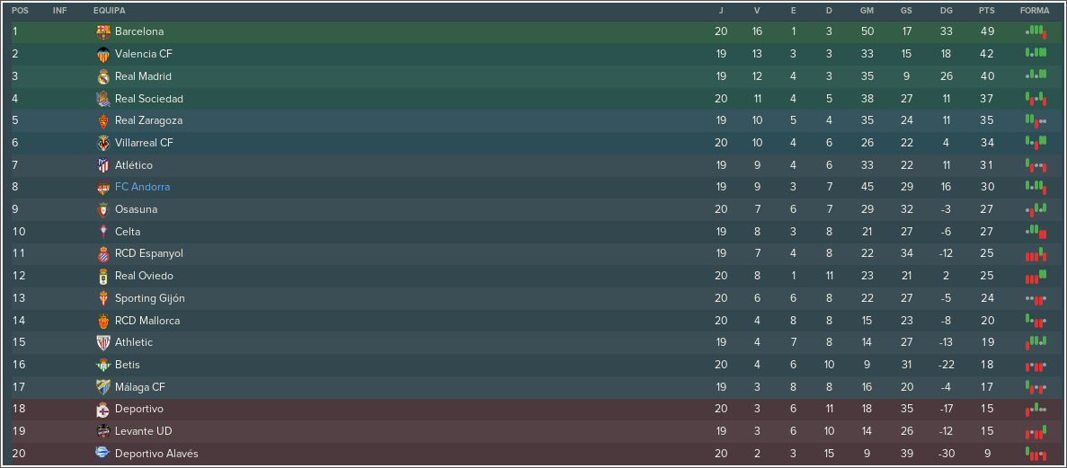 A campanha do FC Andorra é excelente. O FC Andorra é o 8.º colocado, com 30 pontos e com esse rendimento todos acreditam que a equipe pode acreditar em uma vaga na Liga Europa. O Villarreal, com uma partida a mais, tem 34 pontos. O rendimento é até inesperado, devido à renovação que Toni Lima se propôs a fazer nesta temporada. Nela, jogadores experientes como Diego Llorente e Saúl, além de históricos como Bernardo Guedes e José Cruzado perderam espaço e sequer jogaram, enquanto jovens como Jesus Anguix (18) e Killian Viaud (17) vem atuando com grande frequência. O primeiro, por sinal, é um dos artilheiros da equipe, com 9 gols em 21 partidas, fazendo jus as expectativas que recaíram sobre o jogador quando chegou ao clube. A personalidade de cidadão-modelo certamente influiu muito na rápida evolução do ponta-esquerda, que teve um ótimo aumento em seus atributos, chegando a ganhar até quatro pontos, como no atributo "aceleração".