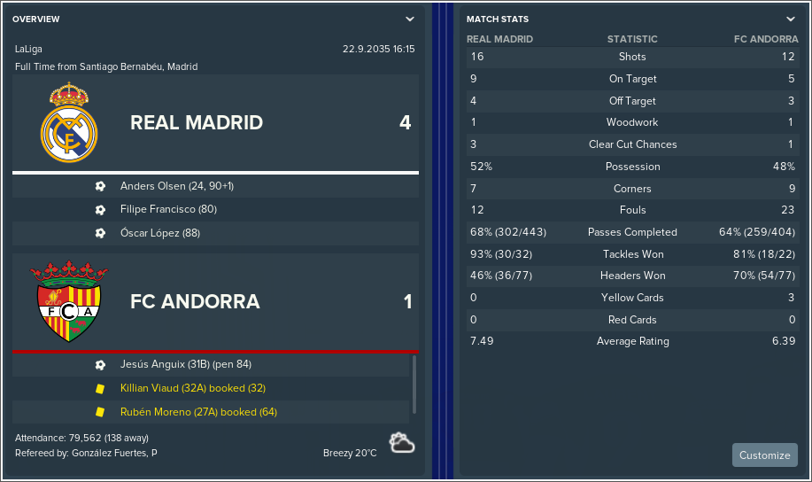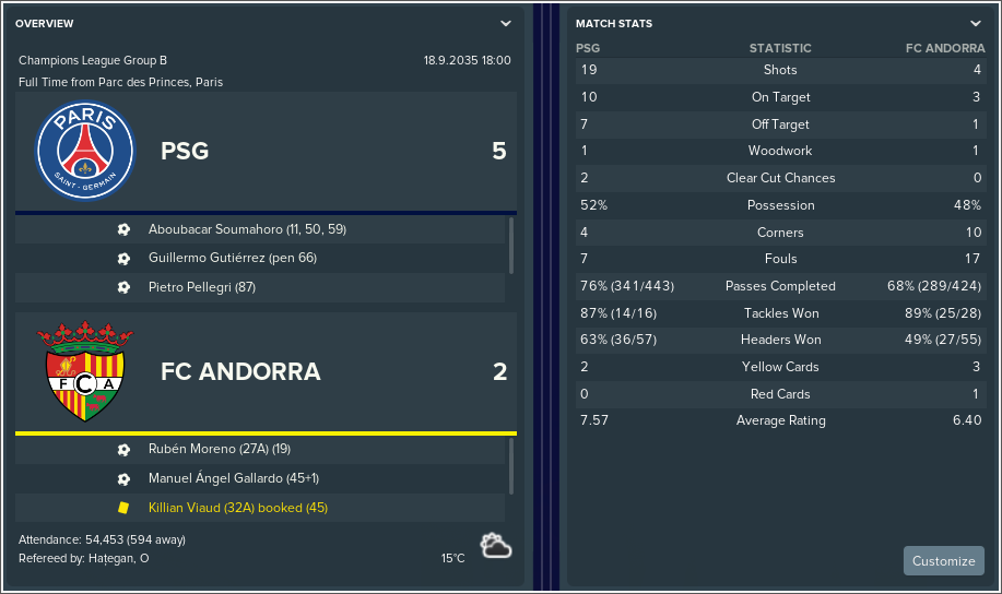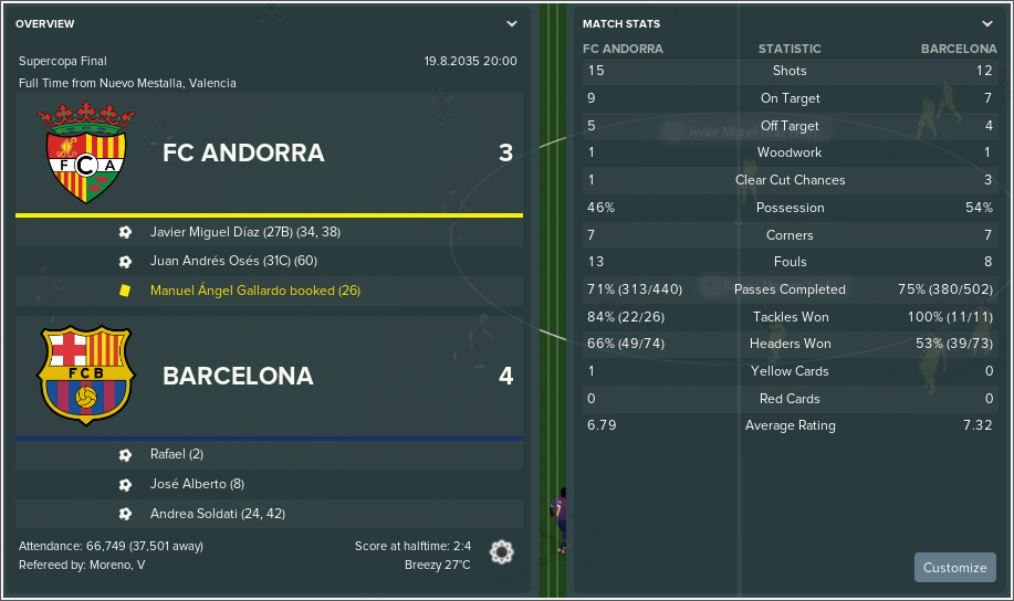 Apenas três dias depois, uma nova final. No Etihad Stadium, em Manchester, o FC Andorra enfrentava a SSC Napoli na grande decisão da Liga Europa. Comandados pelo ex-zagueiro Giorgio Chiellini, desde 2033, os napolitanos, eliminados da Liga dos Campeões em um grupo com Valencia e Manchester City, deixaram pelo caminho o Ajax, o Lyon, o Fenerbahce e o AC Milan pelo caminho na Liga Europa. Era um rival mais acessível, é inegável, mas todos sabiam o quanto a Napoli iria endurecer a partida.