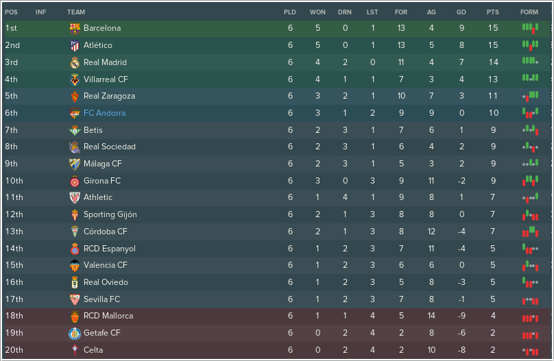 A temporada está apenas começando e apesar do início irregular, o FC Andorra é o 6. º colocado com 10 pontos e a distância de cinco pontos para Barcelona e Atlético ainda não assusta tanto.