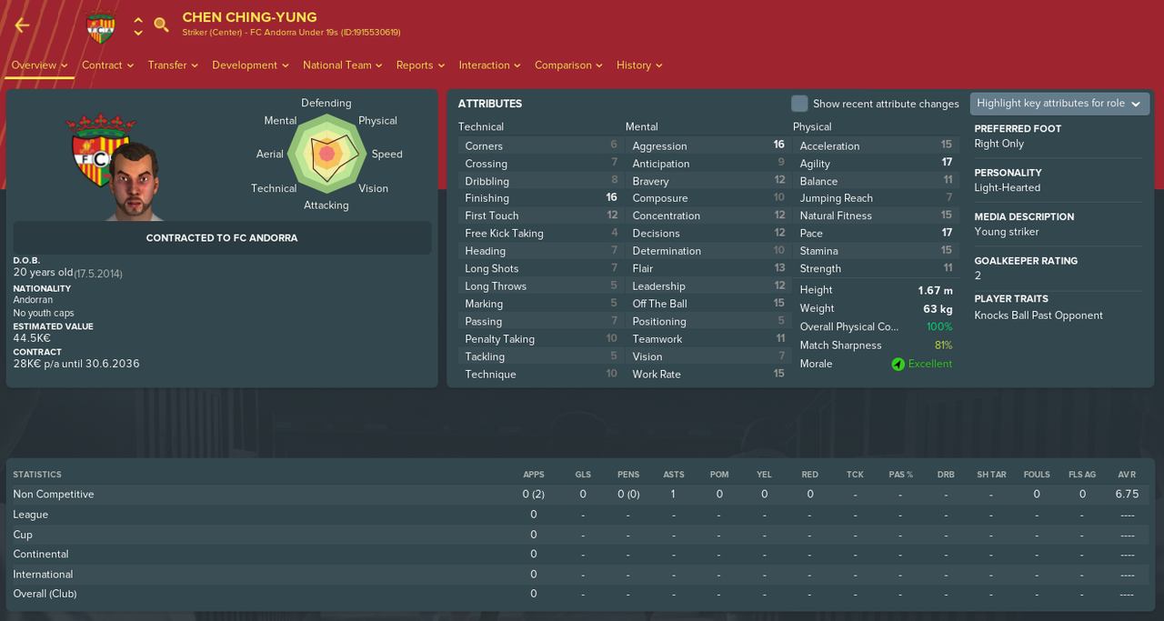 O FC Andorra contratou o centroavante Chen Ching-yung, nascido em Taipei, porém naturalizado andorrano, que atuava no CF Carroi e era o artilheiro da atual edição da Primera Divisió. O jogador de 20 anos é destacado por sua velocidade e boa finalização, que lhe renderam 8 gols em 10 partidas no ex-clube.