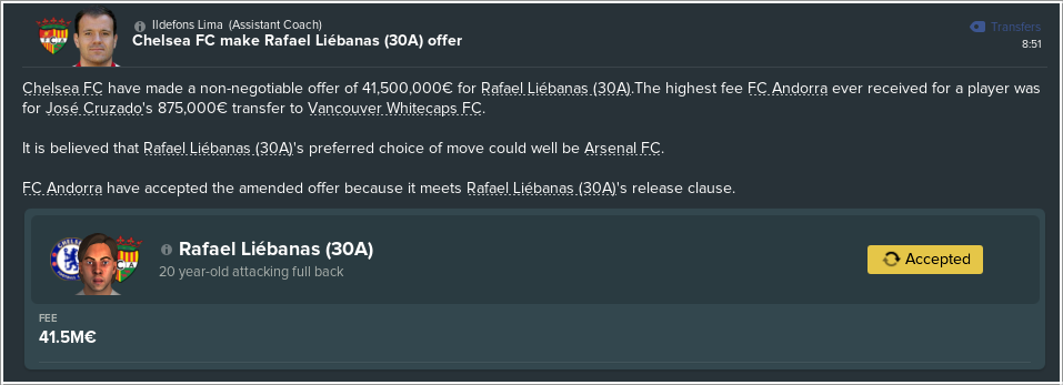 Após ter duas propostas recusadas, o Chelsea ofereceu o valor da multa contratual para levar o lateral-direito Rafael Liébanas, no valor de 41,5 milhões de euros. O lateral, entretanto, recusou a proposta do time inglês e optou por continuar no FC Andorra.