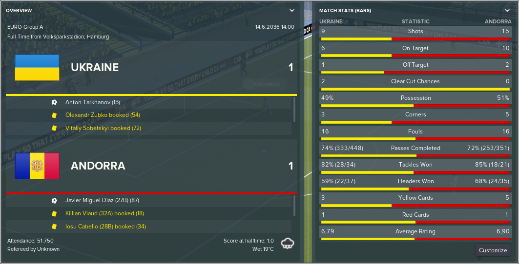 O Volksparkstadion, em Hamburgo, foi o palco da estreia andorrana na competição, contra a Ucrânia, comandada por Yaroslav Rakitskyi ua.png. A Ucrânia abriu o marcador aos 15 minutos, com o ponta Anton Tarkhanov ua.pngque concluiu após um ótimo contra-ataque dos Zhovtyy-Syniy. Com valentia, os ucranianos resistiram enquanto puderam, mas aos 87 minutos, Javier Miguel Díaz ad.png  teve um mínimo espaço e arriscou da entrada da área, no canto, e empatou a partida para Andorra, que foi melhor e talvez merecesse mais do que um ponto.