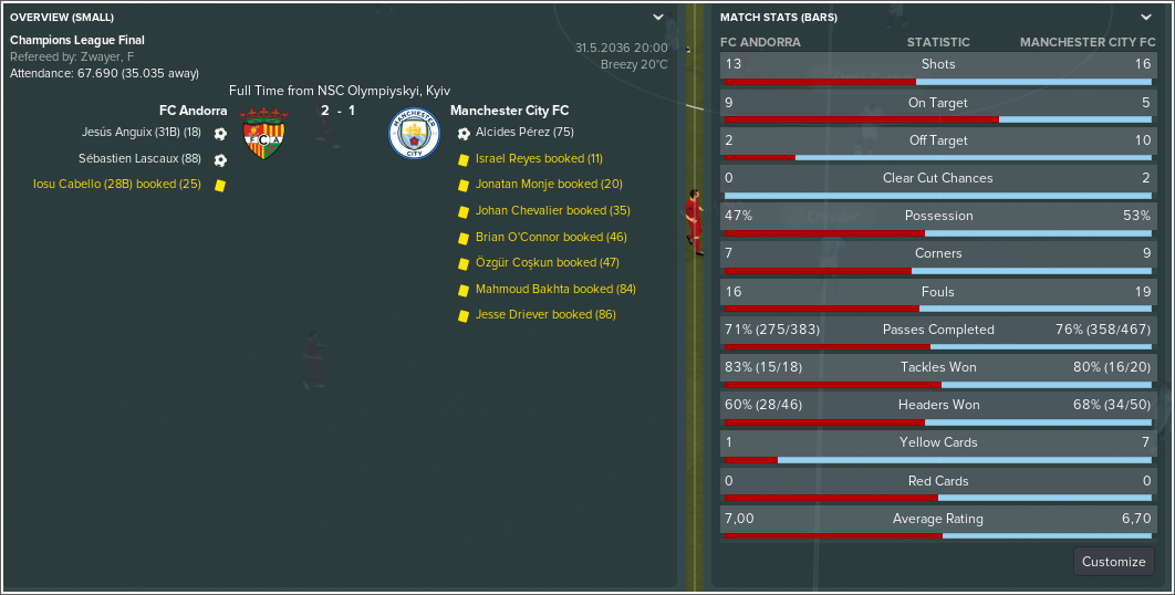 Daquele momento até o fim, foram cerca de quatro minutos, com o Manchester City apostando na bola aérea, mas esbarrando na ótima atuação da defesa andorrana. Às 21 horas e 54 minutos (horário local), o árbitro Felix Zwayer pediu a bola e apitou o fim da partida. FC Andorra, campeão da Liga dos Campeões Europeus 2035/36! 1709.png