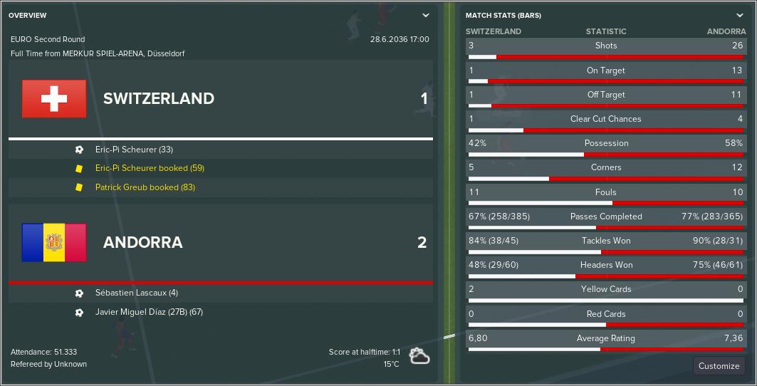 Como em 2032, Andorra enfrentou a Suíça ch.png. Comandada pelo ex-jogador Shani Tarashaj ch.png de 41 anosa seleção helvética passou em segundo lugar no Grupo C, empatando com Alemanha e Eslováquia e vencendo a Noruega. Na Merkur Spiel-Arena, em Dusseldorf, Andorra teve outra vez um rendimento excelente e merecia até mais gols do que fez. No início da partida, aos 4 minutos, Sébastien Lascaux ad.png abriu o marcador para Andorra, recebendo um passe açucarado de Javier Miguel Díaz. O empate suíço veio no primeiro tempo, em uma das poucas chegadas da equipe, que culminou com o gol de Eric-Pi Scheurer ch.pngAndorra continuou criando chance após chance, mas somente aos 67 minutos, quando após uma ótima troca de passes, Javier Miguel Díaz ad.png marcou o gol que acabou sendo o da vitória que levou Andorra mais uma vez às quartas de final.