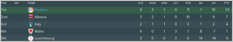 Ambas as partidas pelas Eliminatórias para a Copa do Mundo foram contra o País de Gales. Andorra, que havia empatado com a Itália (1 a 1) e vencido Luxemburgo (5 a 0) em março, precisava da vitória, predizendo uma disputa polarizada ponto a ponto com os italianos.