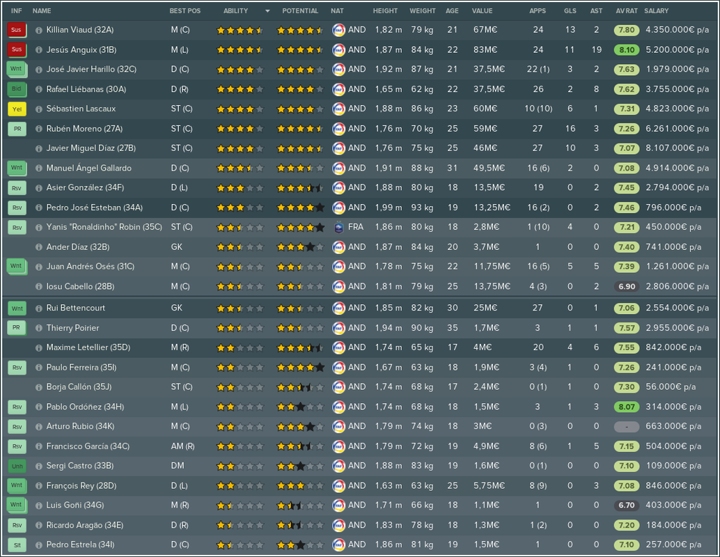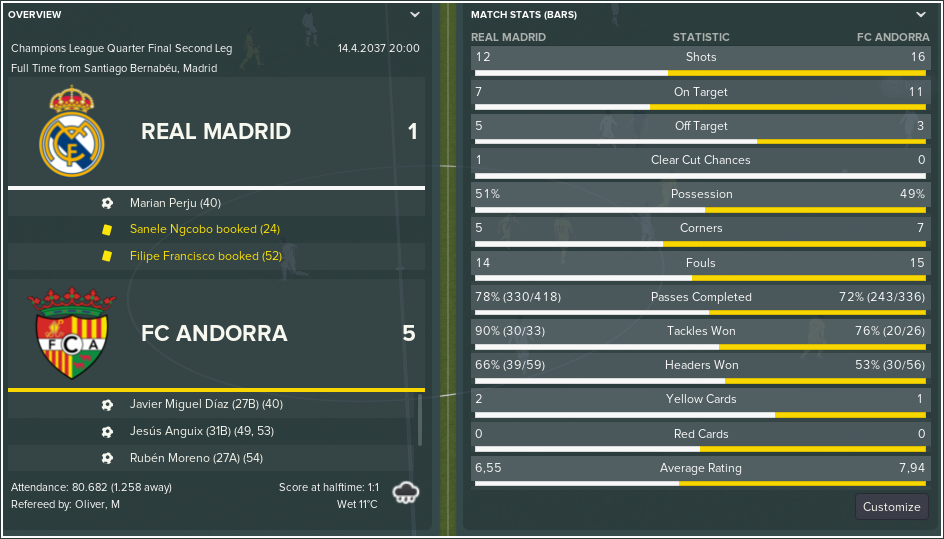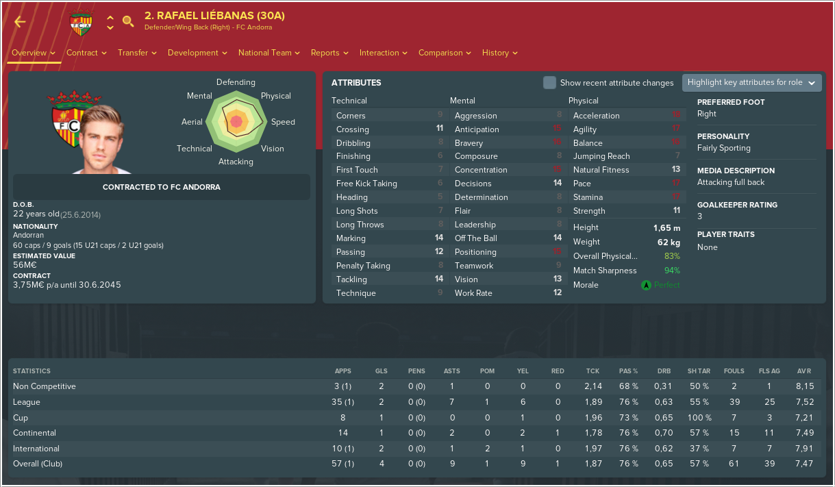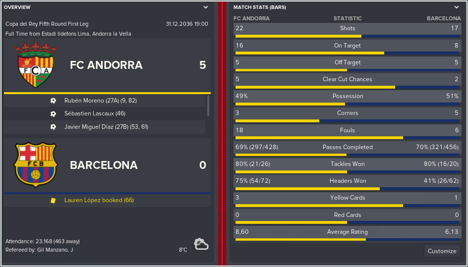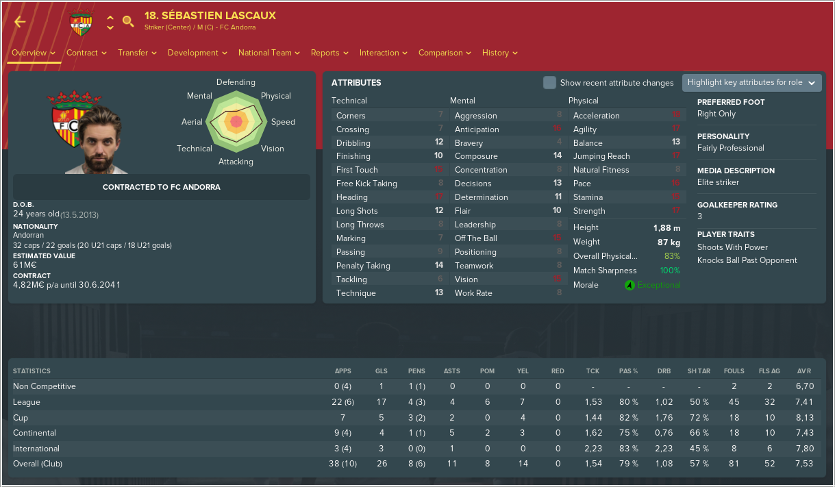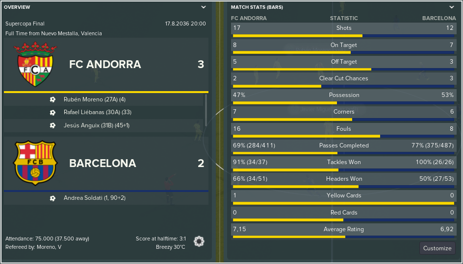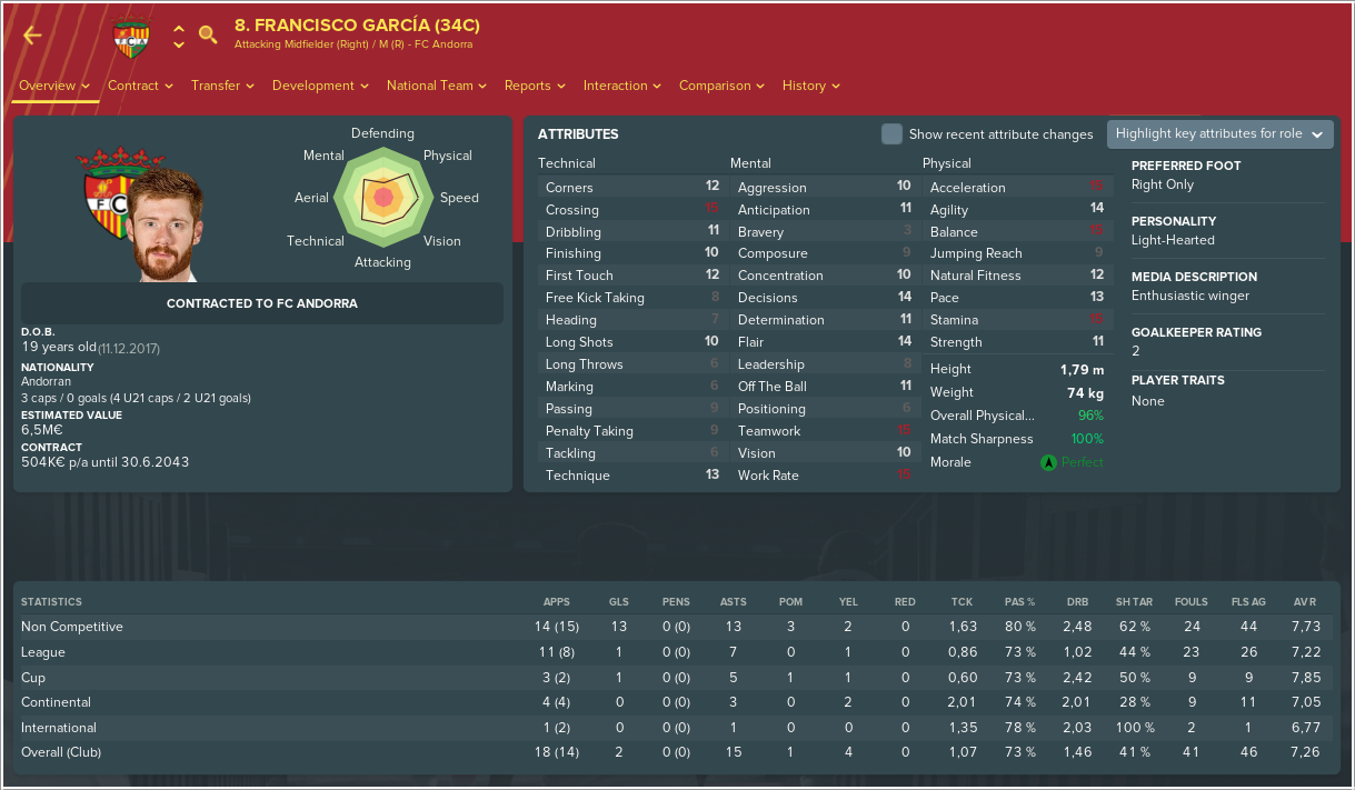 Não há outra palavra que possa representar essa campanha até o momento que não seja "fantástico". Há tropeços também, mas não se pode ganhar todas. Me impressiona mais é o título espanhol de forma invicta, pois o nível de La Liga é altíssimo, daí se vê o nível do Andorra. Na atualização anterior vi você batendo o pé quanto ao valor de multa rescisória que exigiu que o time alemão pagasse pelo jogador Jesús Anguix. Gosto desse tipo de coisa, não dá para perder jogador no momento em que você consegue montar a equipe ideal só porque eles querem. Está desanimado a continuar?