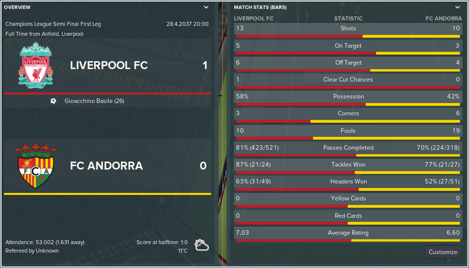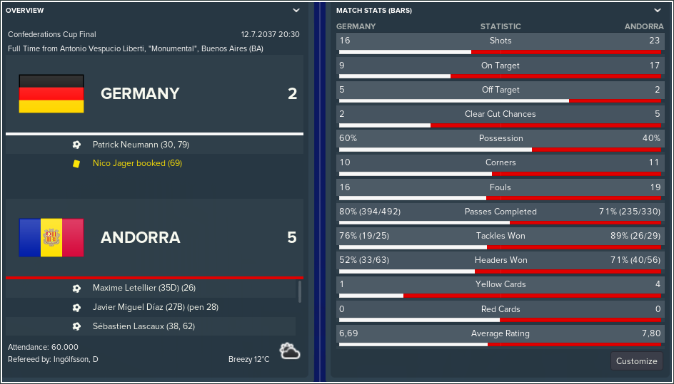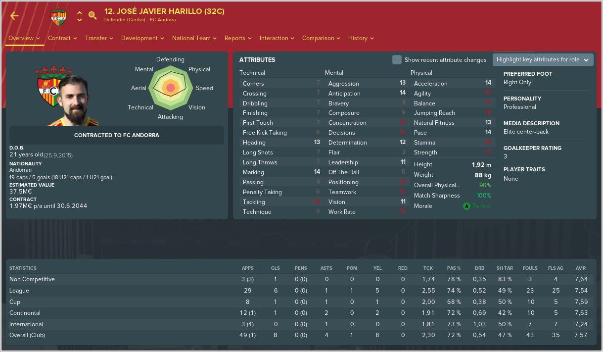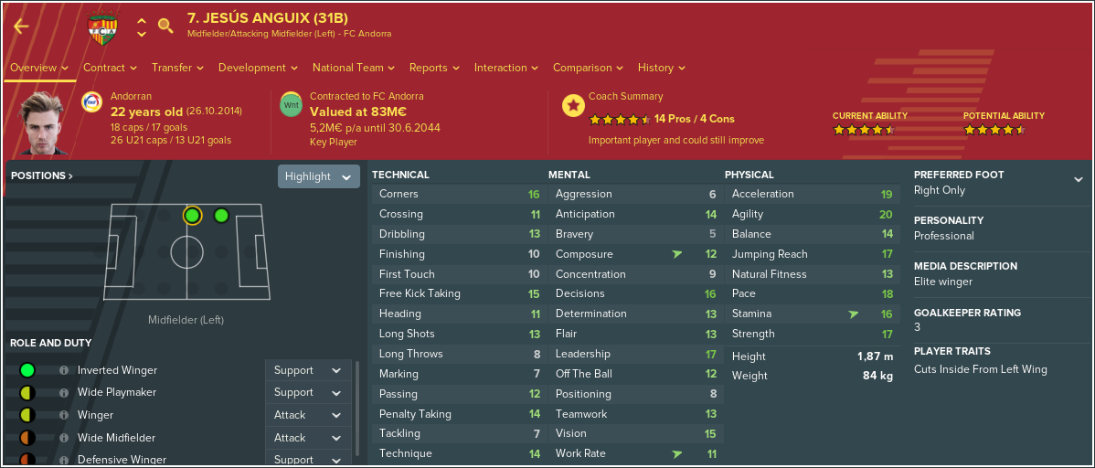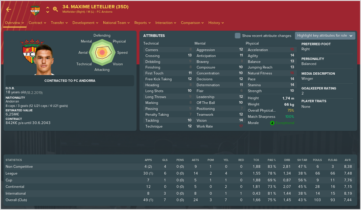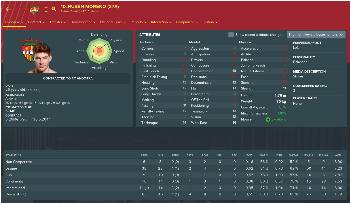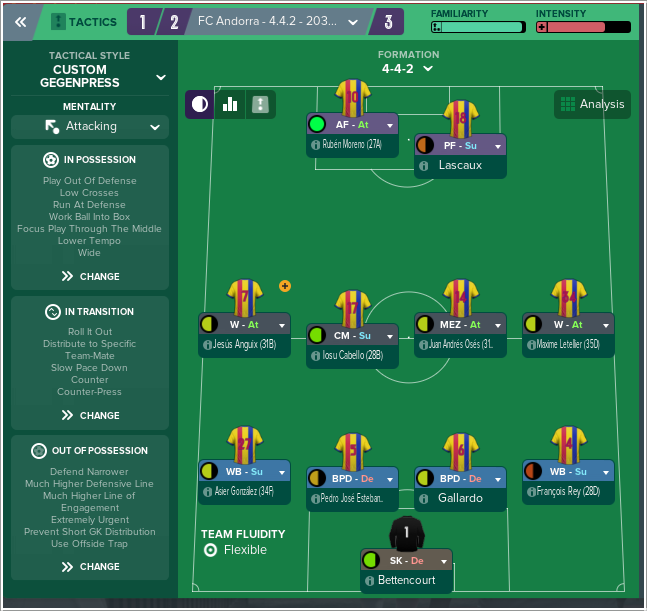 Não há outra palavra que possa representar essa campanha até o momento que não seja "fantástico". Há tropeços também, mas não se pode ganhar todas. Me impressiona mais é o título espanhol de forma invicta, pois o nível de La Liga é altíssimo, daí se vê o nível do Andorra. Na atualização anterior vi você batendo o pé quanto ao valor de multa rescisória que exigiu que o time alemão pagasse pelo jogador Jesús Anguix. Gosto desse tipo de coisa, não dá para perder jogador no momento em que você consegue montar a equipe ideal só porque eles querem. Está desanimado a continuar?