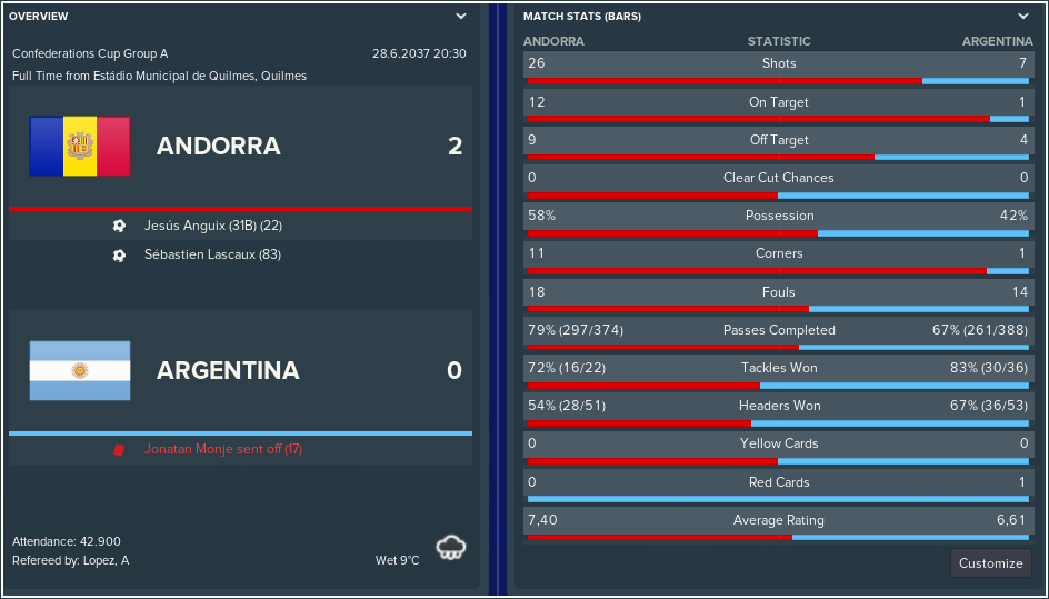 No Estádio Municipal de Quilmes, Andorra não respeitou a anfitriã e dominou a partida desde o apito inicial. Quando a Argentina perdeu Jonatan Monje 064-argentina.pngpor uma falta dura, aos 17 minutos, as coisas tornaram-se ainda mais fáceis para uma Tricolor que venceu por 2 a 0, mas poderia ter vencido por mais. Jesús Anguix 102-andorra.png, aos 22 minutos, e Sébastien Lascaux 102-andorra.png, aos 83 minutos, marcaram os gols.