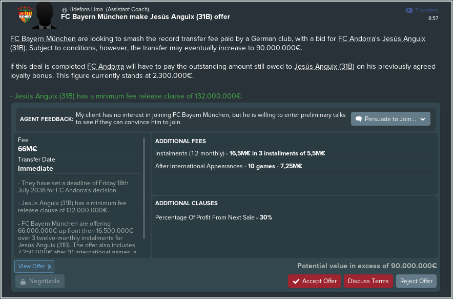 Antes do início da temporada, o Bayern de Munique ofereceu a quantia de 90.000.000€ para levar Jesús Anguix. Apesar do desejo do jogador de ir para a Bavaria, o FC Andorra bateu o pé e exigiu o valor da multa (132.000.000€) e o time alemão não quis pagar para levar o jogador que viria a ganhar os prêmios Ballon d'Or e FIFA Best Men's Player com o incrível número de 23 gols e 32 assistências em 52 partidas.