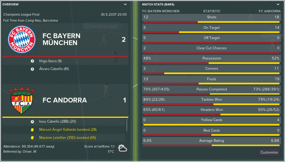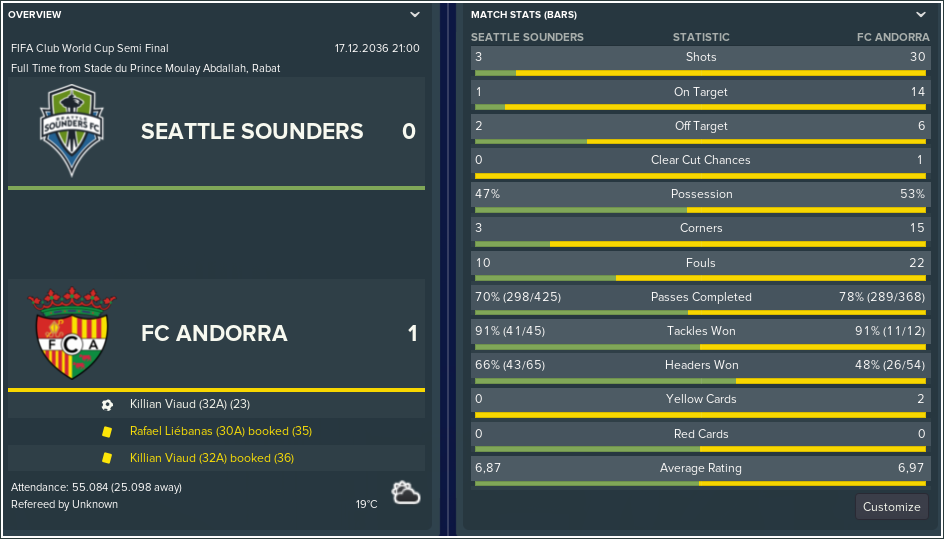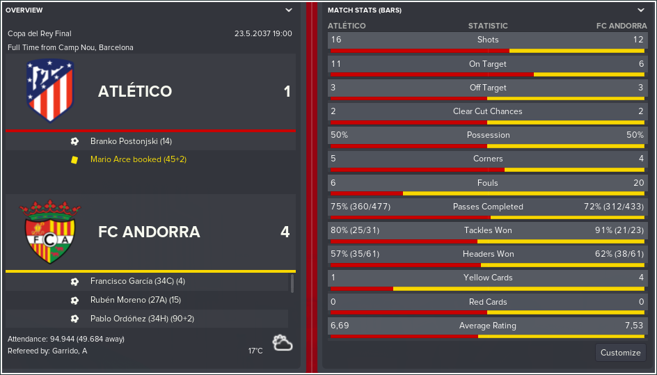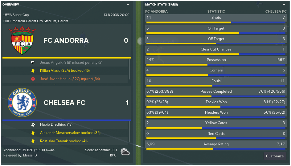 Sobre o save em si, eu prefiro não chamar de desânimo, mas sim a vontade de iniciar um novo projeto, no FM20, e meu tempo não me permite dedicar a duas histórias, infelizmente. Ademais, de que, querendo ou não, há uma tendência das coisas ficarem mais fáceis para o FC Andorra daqui em diante e penso que é melhor encerrar após uma temporada do que em meados de outra. Já será a 20ª temporada em 1 ano e 2 meses de save (meu save mais longo de todos os tempos de FM) e que me proporcionou muita coisa legal. Vamos vendo o que acontece.