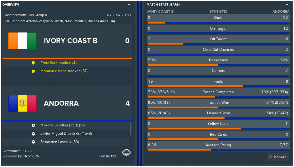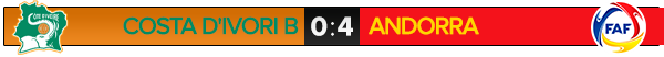 Já classificada, Andorra enfrentou a Costa do Marfim B na 3ª Rodada. Campeã da Copa das Nações Africanas em 2035, os marfinenses optaram por mandar a equipe B devido à disputa quase simultânea da edição de 2037 da competição continental. Assim, com muita tranquilidade, Andorra ganó, gustó y goleó. Maxime Letellier 102-andorra.png abriu o marcador, aos 10 minutos. Javier Miguel Díaz 102-andorra.png ampliou, no fim do primeiro tempo e ainda perdeu um pênalti no início do segundo, que teve gols de Sébastien Lascaux 102-andorra.png e Rubén Moreno 102-andorra.png para completar a goleada por 4 a 0.