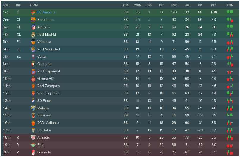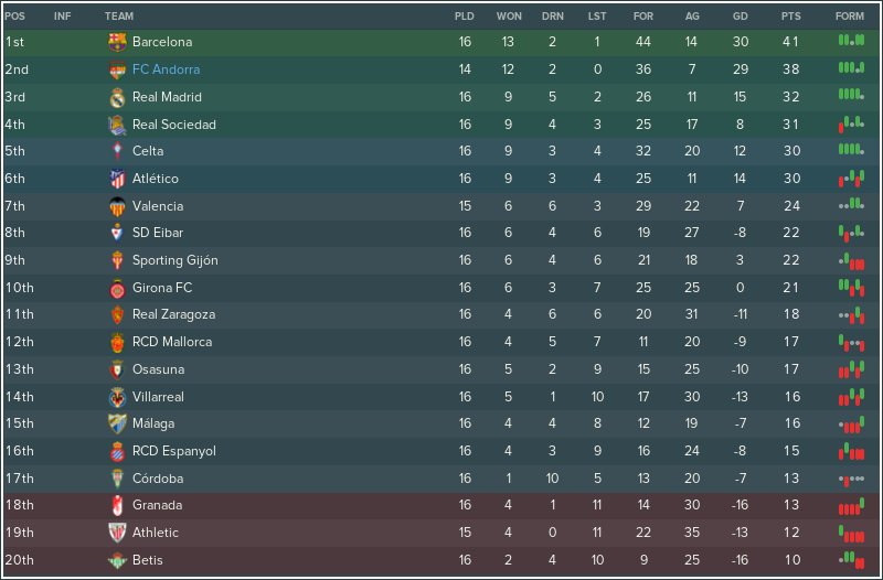 O Barcelona 1708.png tem 41 pontos e aparentemente será o único rival do FC Andorra na luta pelo título nacional: Real Madrid 1736.png (32), Real Sociedad 1742.png (31), Celta 1724.png (30) e Atlético 1687.png (30) vêem de longe o desempenho dos catalães e dos andorranos.