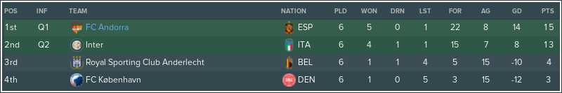 Na Liga dos Campeões, o FC Andorra teve um grupo relativamente fácil, ao lado de Internazionale 1135.png, Anderlecht 256.pngKøbenhavn 505.png. Com cinco vitórias e uma média de mais de três gols por partida, o Tricolor terminou em primeiro e enfrentará os portugueses do Benfica nas oitavas de final. Aqui, entretanto, aconteceu a outra derrota do clube na atual temporada, quando, com vários desfalques, o Tricolor caiu por 5 a 3 para a Internazionale 1135.png