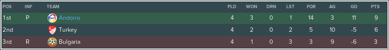 Turquia 799.png e Bulgária 760.png compuseram o grupo ao lado da Tricolor e o título veio após três vitórias e uma derrota, para a Bulgária, em uma partida onde Toni Lima visivelmente subestimou os búlgaros e colocou um time repleto de jovens, inclusive dois jogadores que sequer integram o time principal do FC Andorra. Infelizmente, a vitória não foi suficiente para a manutenção da Lavovete, que retorna a Liga C.