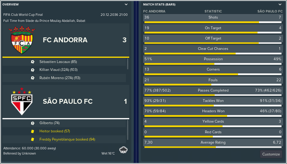 Há poucos dias, o FC Andorra somou mais um troféu a suas vitrines. Sem ter uma viagem muito longa, a equipe foi à Marrocos disputar o Mundial de Clubes e mesmo jogando ambas as partidas em marcha-lenta, conseguiu o título. Na semi-final, o Tricolor venceu os norte-americanos do Seattle Sounders 72014006.png, e na final os brasileiros do São Paulo 337.png, por 1 a 0 e 3 a 1, respectivamente.