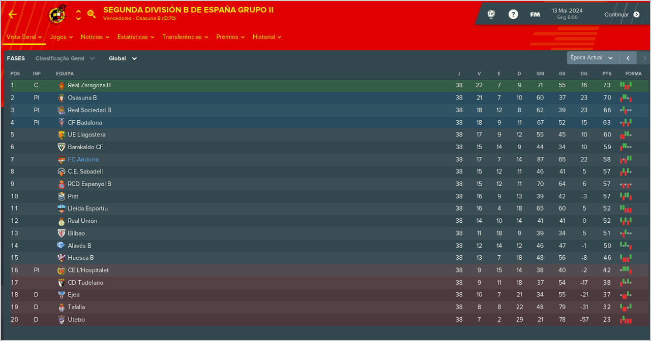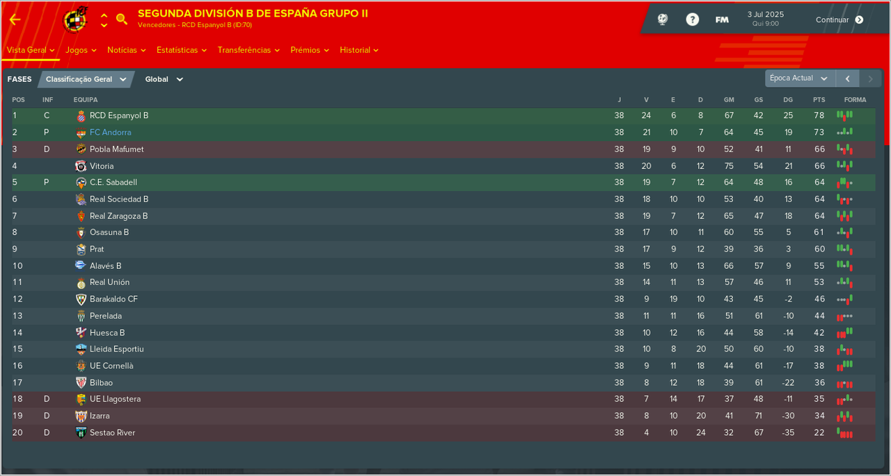 Esse detalhamento que você fez sobre as finanças é super interessante, pois é muito prazeroso quando os frutos são colhidos da venda de jogadores em que percentuais acordados anteriormente fazem a diferença no caixa do clube. Muito boa notícia mesmo. Nesse jogo contra o Espanyol B, o Andorra se mostrou mais eficaz que o adversário, pois teve menos finalizações e ainda assim fez 5 gols, pena que no finalzinho a equipe deles acabou surpreendendo. Acredita que a equipe se encontra equilibrada para se manter na parte de cima da tabela? Bom trabalho na sequência!