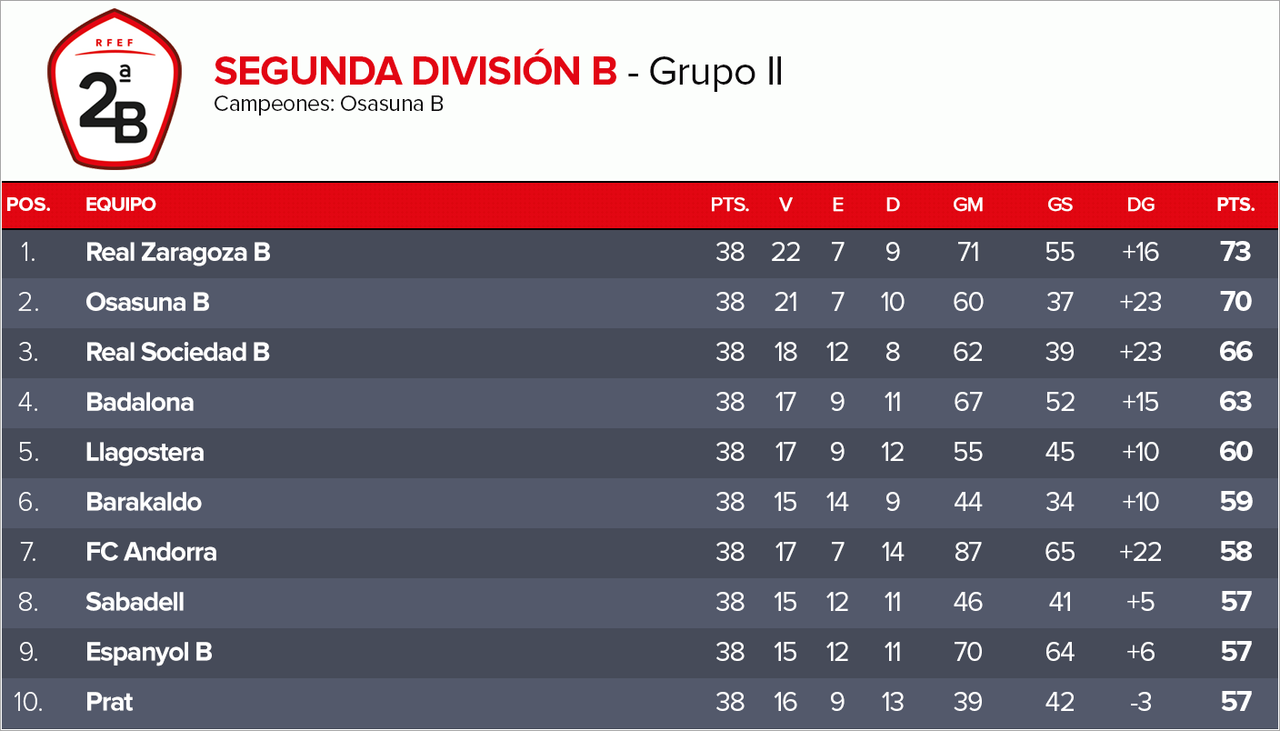 Foram dez vitórias, quatro empates e cinco derrotas, que dão ao FC Andorra um total de 34 pontos. Os três primeiros colocados (Sabadell, Real Sociedad B e Espanyol B) conseguiram uma pequena distância e caminham à frente, mas a disputa continua bem equilibrada, com os nove primeiros colocados vivos na disputa para ir aos Playoffs.