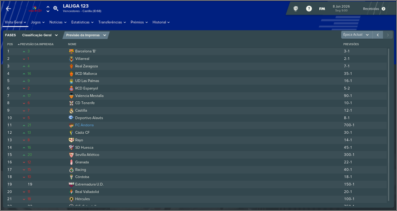 Esta temporada foi de estabilização na divisão, e os resultados obtidos foram bastante bons, até pelo nível dos jogadores de Andorra. Gostei da ideia de  tentar trazer um grande nome espanhol ou frances para o clube. Isso daria algo de diferente e interessante ao save.