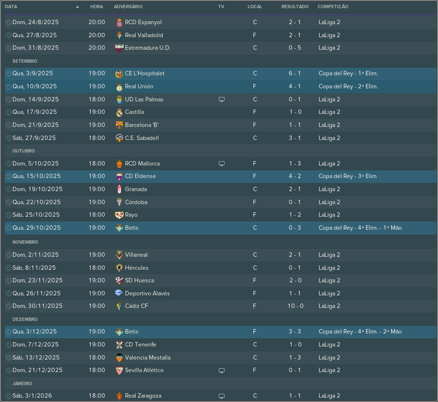 Oi, Andreh. Sofremos duas derrotas impactantes no decorrer da temporada — 0-5 contra o Extremadura e 0-6 contra o Las Palmas —, fora as outras derrotas, visto que perdemos mais do que vencemos na temporada. No entanto, o importante é que a temporada foi tranquila e conseguimos a manutenção.