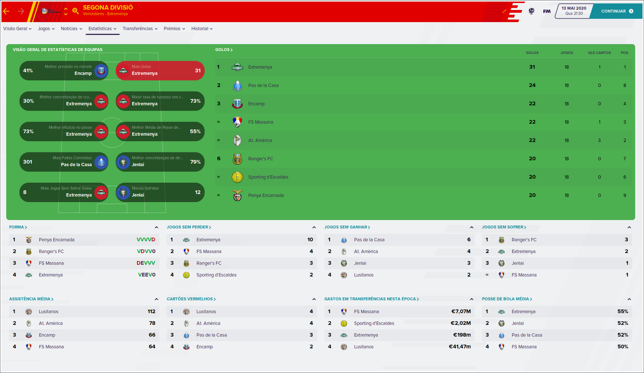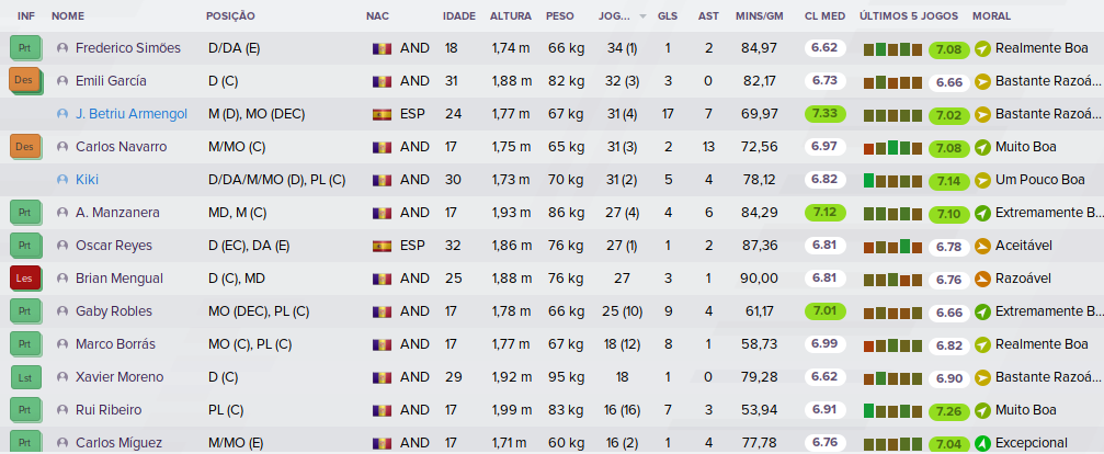 Estatística do Elenco: Extremenya | At. AmèricaFS MassanaEncamp | Jenlai | Sporting d'Escaldes | Ranger's FC | Pas de la Casa | Penya Encarnada | Lusitans