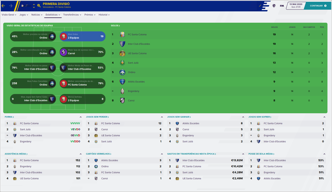 Inter e FC Santa Coloma se enfrentaram na última rodada. Com um ponto a mais, a equipe de Fernando Diniz dependia apenas de um empate. No entanto, a vantagem durou apenas nove minutos, pois Ragnar Sigurðsson foi o primeiro herói da noite ao marcar para o FCSC, que teve um par de chances de aumentar a vantagem, mas só conseguiu no finalzinho do primeiro tempo, com Pawel Tomczyk. Aos 63', Fred teve a chance de recolocar o Inter no jogo, mas perdeu uma chance claríssima, cara a cara com Kawashima, que encaixou a débil finalização do brasileiro. Aos 85', Cazorla deixou o brasileiro novamente em uma situação de 'é só fazer', mas Fred chutou em cima de Kawashima mais uma vez. Nos acréscimos, Carlos Prates ainda marcou o terceiro para sepultar um Inter que liderou mais de 95% da temporada e viu o título escapar no apagar das luzes.
