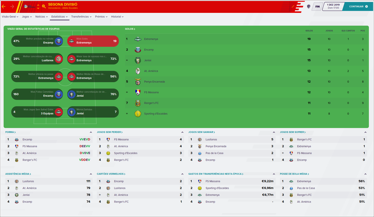 Mas quem não tem nenhum motivo para comemorar é o Lusitanos. Sam Allardyce não consegue e parece que não vai conseguir fazer a equipe jogar. Com apenas uma vitória, um empate e sete derrotas, os lusos estão na última posição e com sete pontos a menos que o penúltimo colocado, Ranger's FC.