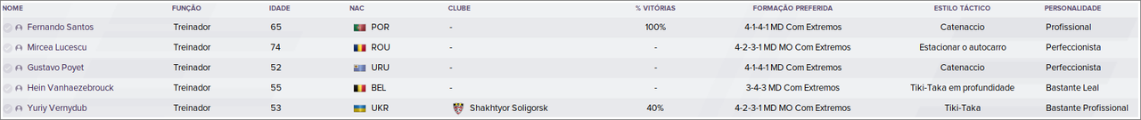 Sobre aqueles que quiserem demitir os treinadores e contratar outras, essa é a lista de suplentes para escolha dessa temporada. Aqui, o diretor que demitir o seu treinador escolhe o que quiser, desde que não tenha sido escolhido por algum outro antes.