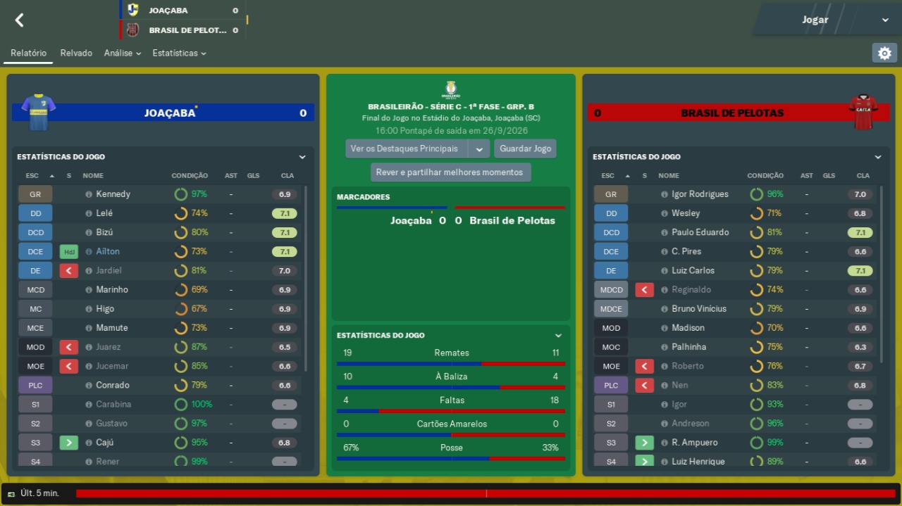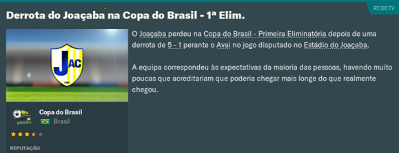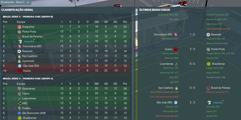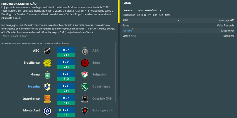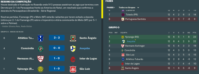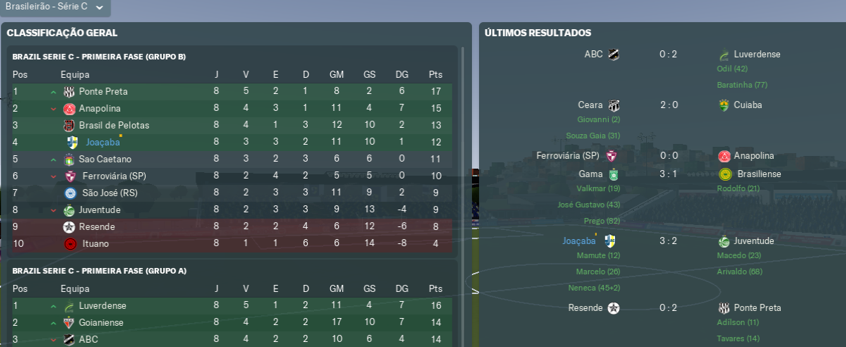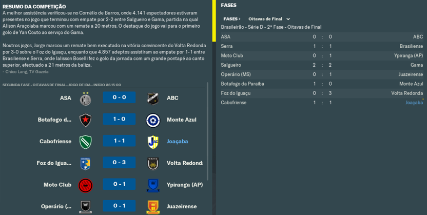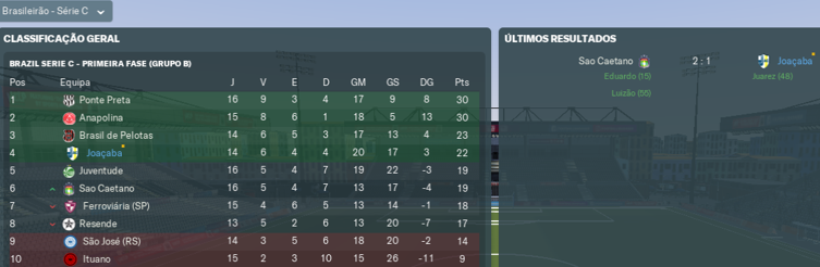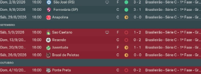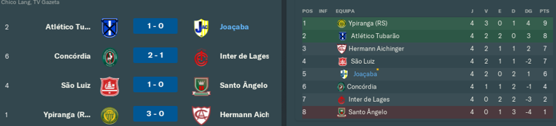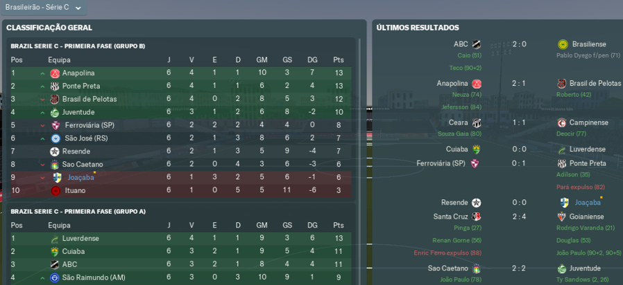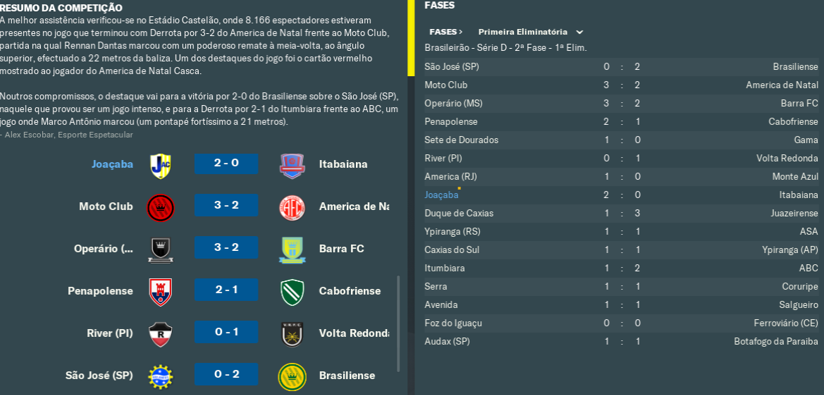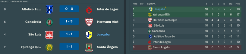 Com a Série D sendo prioridade no momento, estreamos na Copa Santa Catarina com time reserva, exceto o goleiro e o armador Dudu, e após levar 2x0 no fim do jogo Dudu da entrada da grande área e Marcio em bola lançada em profundidade conseguiram arrancar um empate. Ernani pensando na situação financeira do Joaçaba renova e estipula multa de 90% se algum clube quiser contratá-lo no futuro. De volta a Série D, fomos a Concórdia, jogo truncado e placar zerado outra vez acaba tirando-nos a liderança do grupo. Pela penúltima rodada era confronto direto pelo acesso frente ao Atlético de Ibirama. Jogo muito pegado e mais uma vez a bola parada estava lá para resolver a situação. Aos 39 Dudu cobra falta e Alemão abre o placar. No contra-ataque (43) Dodô desconta, mas aos 53 Candia cobra falta e põe "lá onde a coruja dorme para fazer 2x1 mais uma vez garantir a classificação para a próxima fase. Hora de ir com tudo na Copa SC. Em casa goleamos por 4 x 0 o Marcilio Dias, com gols de bola rolando dessa vez, sendo 2 de cruzamentos dentre os quais um de Rener mais uma vez e na sequencia nova goleada, 3x0 nos Reservas do Figueirense, com Marcelo abrindo placar de falta. Por fim fomos a Concórdia e imprimindo marcação forte abrimos 2 x 0 em dez minutos vencendo mais uma no torneio estadual. De volta a Série D cumprindo tabela poupei os titular e nos minutos finais o time cansou levamos 2 gols e perdemos por 3x1. Antiético com o São Paulo-RS que brigava para não cair? Eu não tenho nada a ver com os objetivos do São Paulo-RS. Nosso objetivo nesse jogo era dosar o elenco para duas competições e muitos jogos na sequência. Perdemos a chance de terminar na liderança mas eu prefiro em competições de mata-mata decidir fora mesmo.