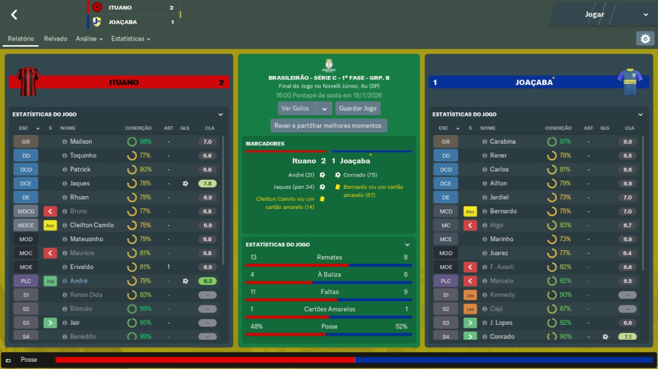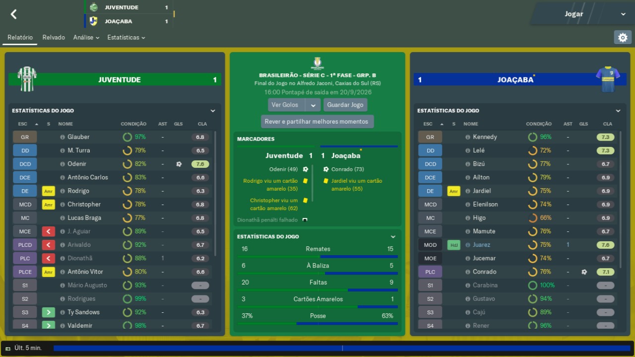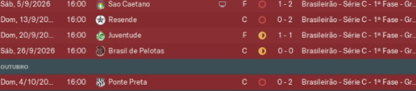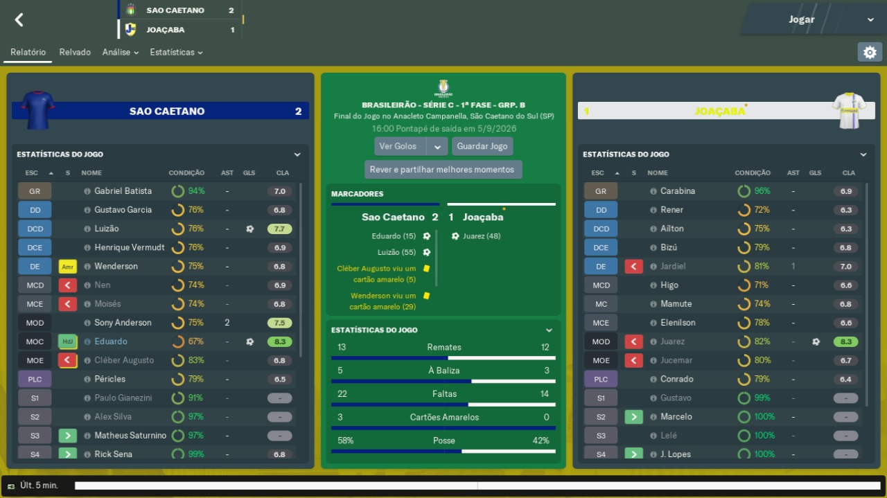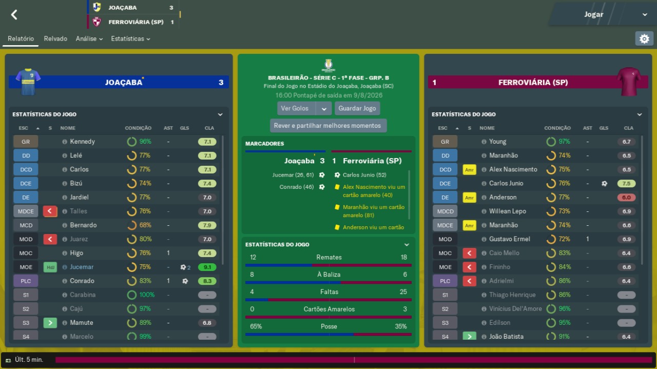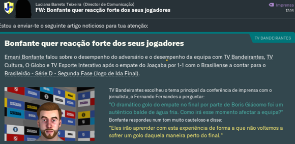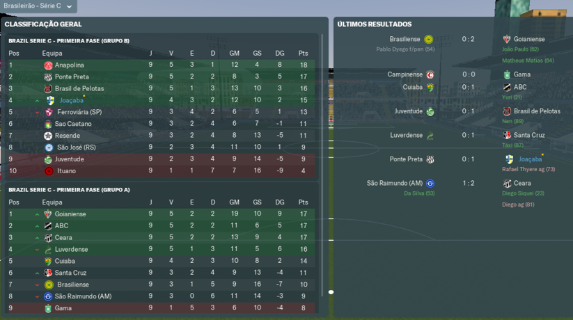 Com a Série D sendo prioridade no momento, estreamos na Copa Santa Catarina com time reserva, exceto o goleiro e o armador Dudu, e após levar 2x0 no fim do jogo Dudu da entrada da grande área e Marcio em bola lançada em profundidade conseguiram arrancar um empate. Ernani pensando na situação financeira do Joaçaba renova e estipula multa de 90% se algum clube quiser contratá-lo no futuro. De volta a Série D, fomos a Concórdia, jogo truncado e placar zerado outra vez acaba tirando-nos a liderança do grupo. Pela penúltima rodada era confronto direto pelo acesso frente ao Atlético de Ibirama. Jogo muito pegado e mais uma vez a bola parada estava lá para resolver a situação. Aos 39 Dudu cobra falta e Alemão abre o placar. No contra-ataque (43) Dodô desconta, mas aos 53 Candia cobra falta e põe "lá onde a coruja dorme para fazer 2x1 mais uma vez garantir a classificação para a próxima fase. Hora de ir com tudo na Copa SC. Em casa goleamos por 4 x 0 o Marcilio Dias, com gols de bola rolando dessa vez, sendo 2 de cruzamentos dentre os quais um de Rener mais uma vez e na sequencia nova goleada, 3x0 nos Reservas do Figueirense, com Marcelo abrindo placar de falta. Por fim fomos a Concórdia e imprimindo marcação forte abrimos 2 x 0 em dez minutos vencendo mais uma no torneio estadual. De volta a Série D cumprindo tabela poupei os titular e nos minutos finais o time cansou levamos 2 gols e perdemos por 3x1. Antiético com o São Paulo-RS que brigava para não cair? Eu não tenho nada a ver com os objetivos do São Paulo-RS. Nosso objetivo nesse jogo era dosar o elenco para duas competições e muitos jogos na sequência. Perdemos a chance de terminar na liderança mas eu prefiro em competições de mata-mata decidir fora mesmo.