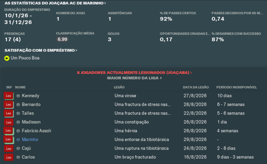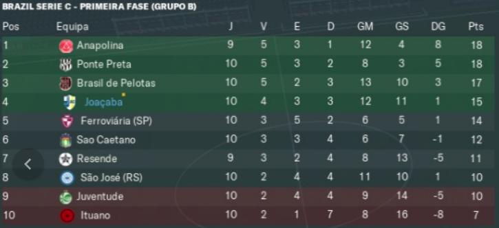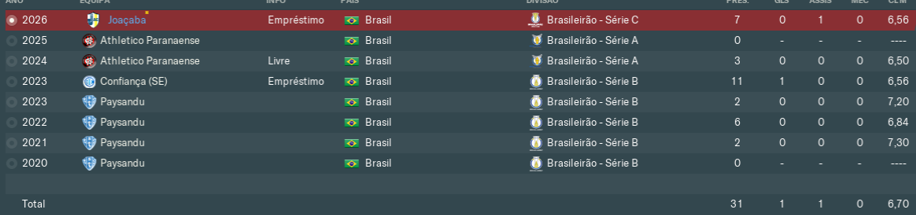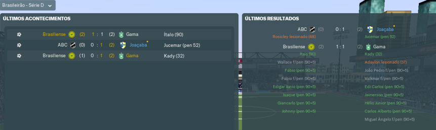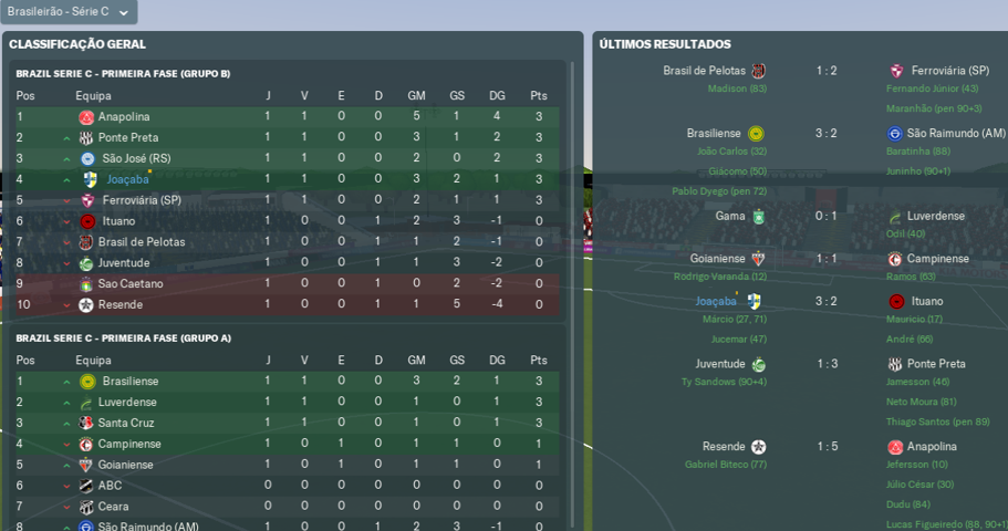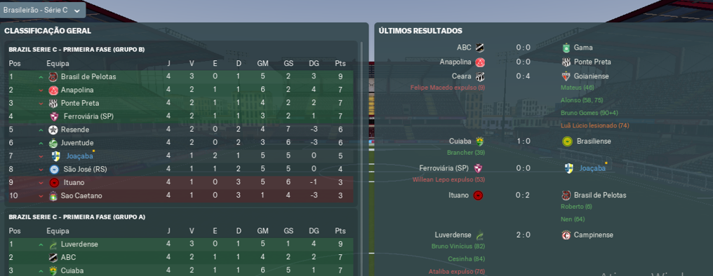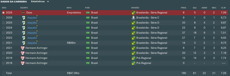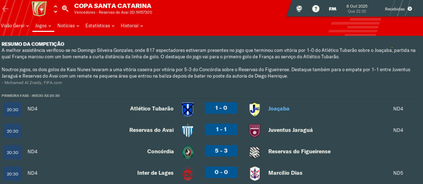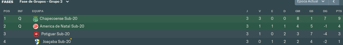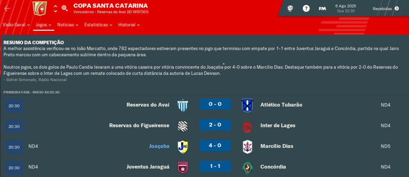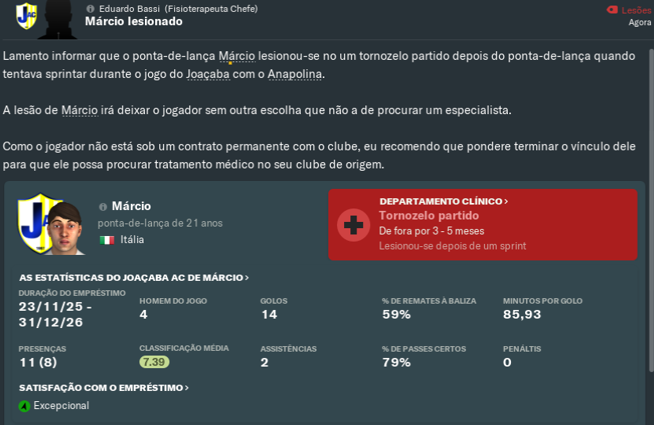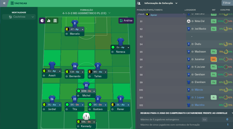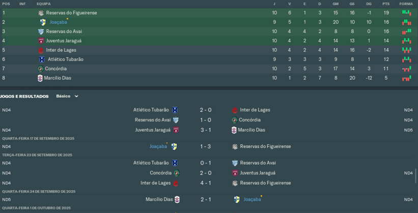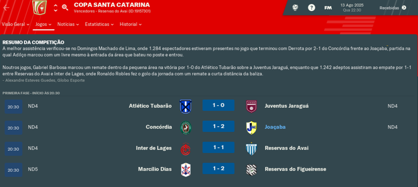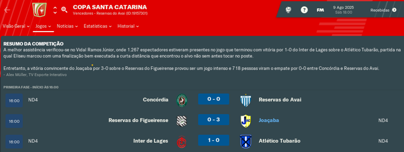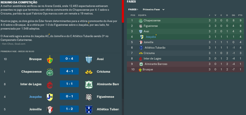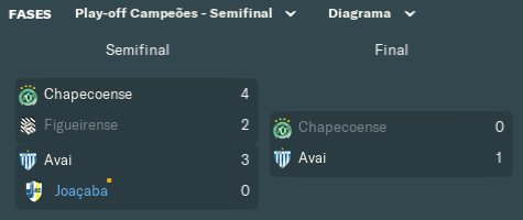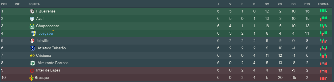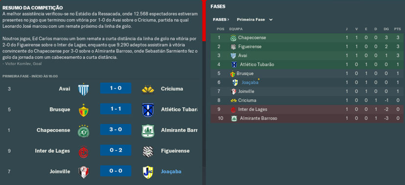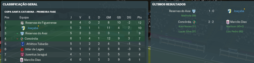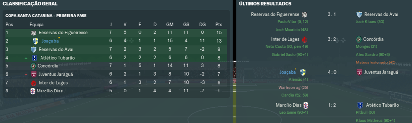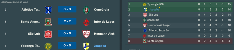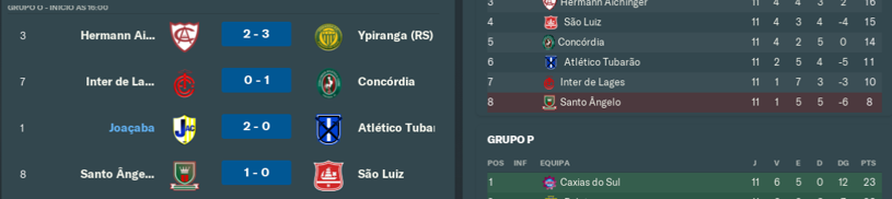 Não é tudo aquilo, até não é tão rápido mas como sabe jogar nas duas pontas e pode ser opção ao ataque resolvemos contratar em definitivo o Lopes.  Começamos o returno com o retorno dos titulares que tavam com fome de bola e massacaram por 5x1 o Joinvile.....estávamos de volta ao G4. Em Lages logo aos 23 eles tiveram um expulso fizemos blitz foram 17 chutes a 1 mas conseguimos vencer por 1x0 e subir na tabela.  Meu colega aqui do forum, o @F J sugeriu contratar o Celso Fernando Jung, que conforme comentei acima e newgen tem uns 22 anos e éx- Paysandu e estava no Athlético Paranaense B que segundo ele é pra ser ele mesmo (e para variar ta jogando nada....).É mais lento que o Marcelo mas mais técnico e sem custos, contratamos para ser reserva. Por 250 mil reais  + 50% de uma venda futura vendemos ao Botafogo a nossa jóia da base Ben Hur. É craque mas estava sem espaço e o clube precisa de dinheiro nesse momento. Na capital, frente ao Figueirense com os reservas mais uma derrota (2x0). Marcelo não está nada bem nessa temporada, porém como não conseguimos vender ou emprestar na totalidade dos vencimentos ele vai para o Doze (ES) com nós pagando metade do salário, podendo retornar quando quisermos. Acho que lá terá menos pressão e retome a boa fase espero. Contra o Almirante 4x2 neles com mais um hat-trick de Marcio. Nesse momento Marcio tinha 5 jogos e 10 gols (e depois dali ...quase não marcou mais). Empate zerado em Tubarão (Atlético Tubarão 0x0 Joaçaba) . Jogo seguinte era confronto direto para ficar mais próxima da vaga para a semifinal e dessa vez melhor para o Leão que venceu o Tigre pelo placar magro de 1x0 num bom jogo.Atuando no contra-ataque e como reservas deu a lógica e perdemos para o AvaíContratado novo armador por empréstimo ao Atletico Mineiro. Além de armador Higo também é boa opção para o meio campo aumentando as opções do técnico. O jogo seguinte era tenso: nós na briga pelo acesso a semifinal e o Brusque na luta contra degola, mas fomos para cima e passamos o trator: Goleada de 3x0 e vaga garantida na semifinal. Fizemos história e eliminamos Joinivile e Criciúma, ficando já garantido entre os 4 melhores do torneio. Fato raro, quase sempre tem 4 grandes na semifinal, a ultima vez que isso não ocorreu foi em 2020, há 6 anos quando o Marcilio chegou na semifinal. Na época eliminado pela Chapecoense, que acabou campeã daquela edição.