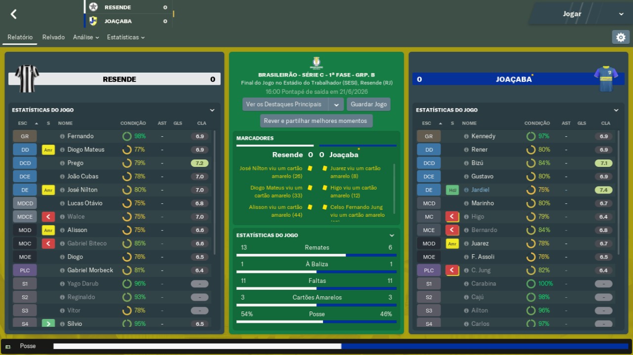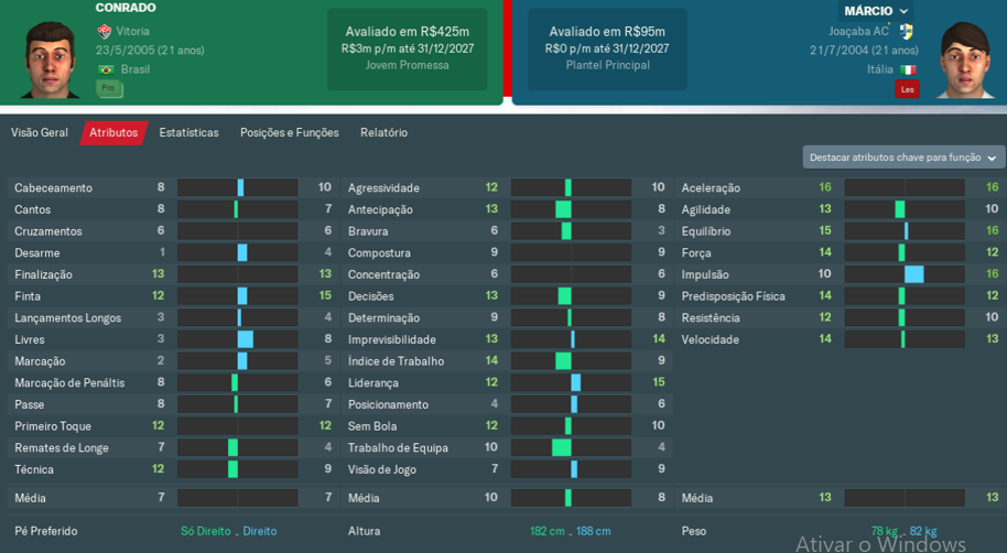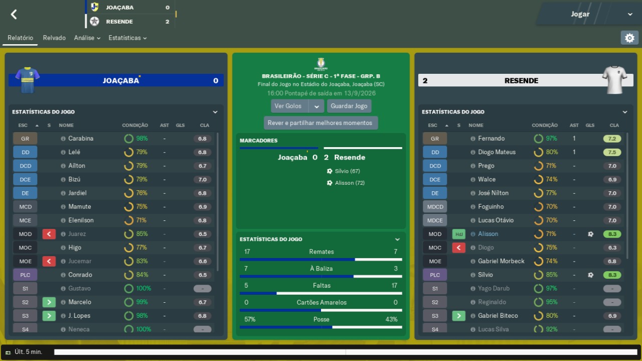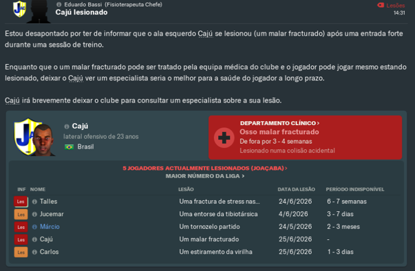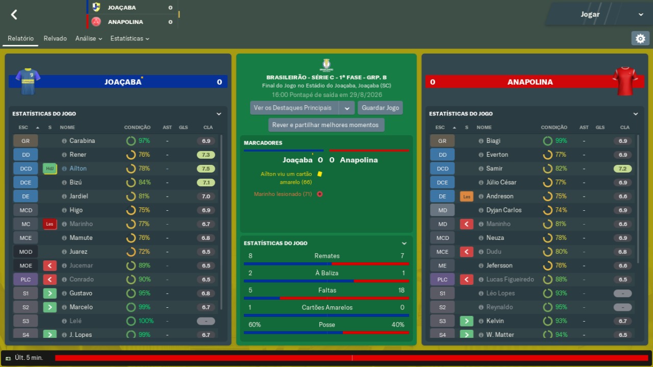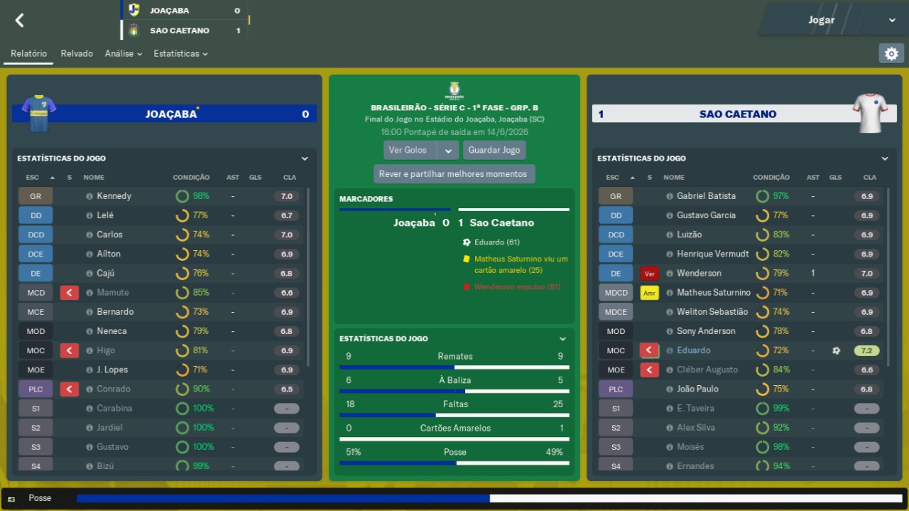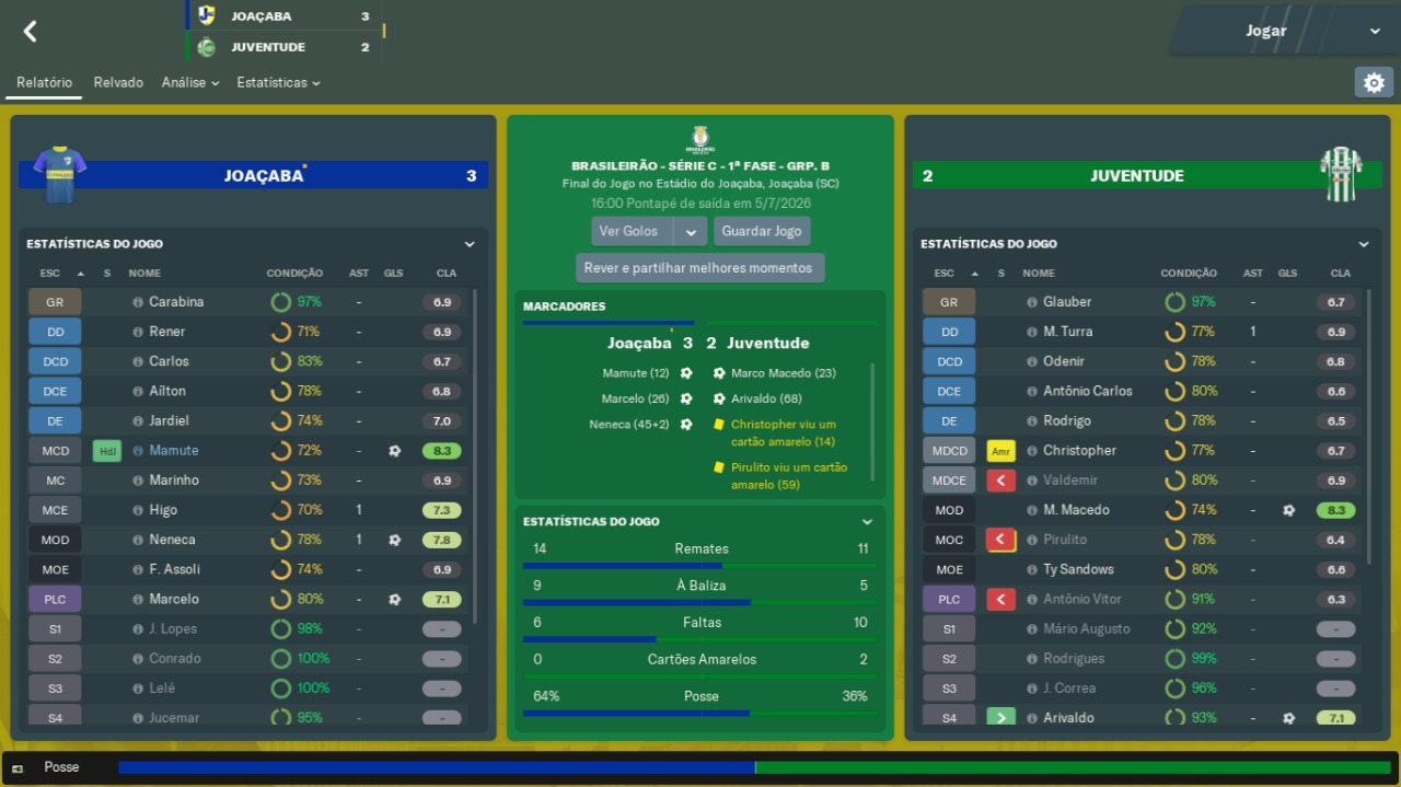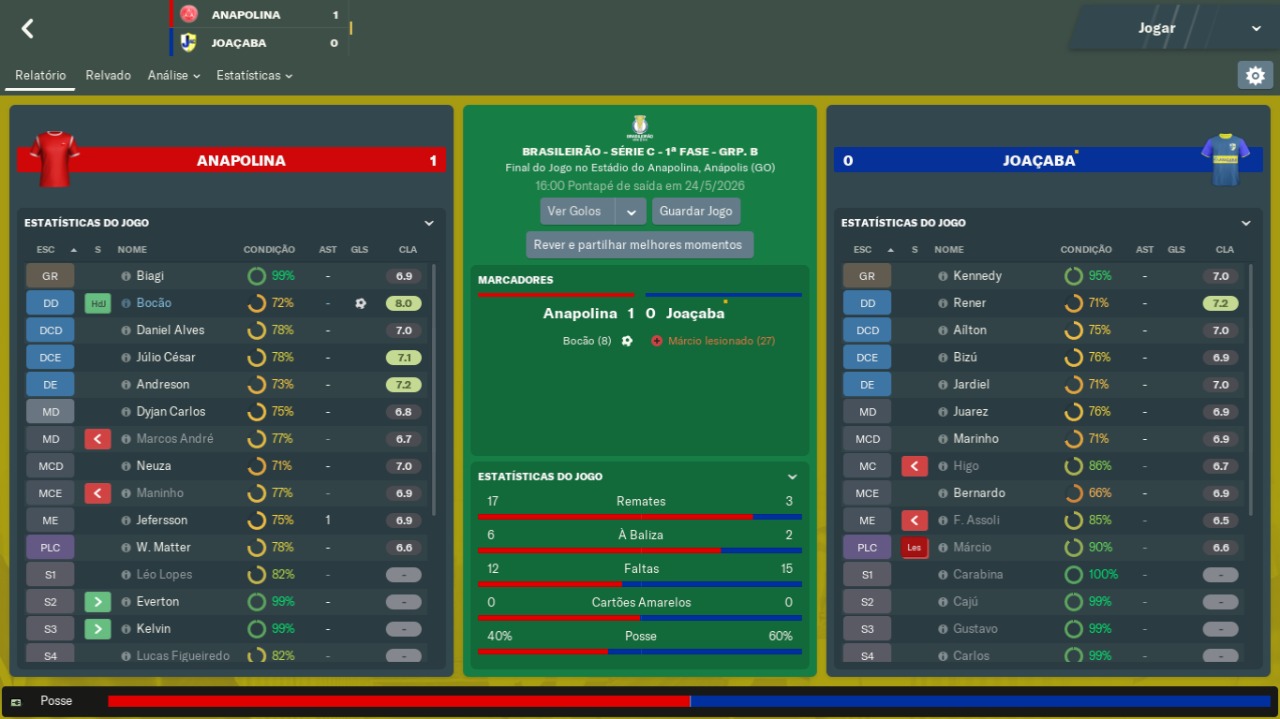 Não é tudo aquilo, até não é tão rápido mas como sabe jogar nas duas pontas e pode ser opção ao ataque resolvemos contratar em definitivo o Lopes.  Começamos o returno com o retorno dos titulares que tavam com fome de bola e massacaram por 5x1 o Joinvile.....estávamos de volta ao G4. Em Lages logo aos 23 eles tiveram um expulso fizemos blitz foram 17 chutes a 1 mas conseguimos vencer por 1x0 e subir na tabela.  Meu colega aqui do forum, o @F J sugeriu contratar o Celso Fernando Jung, que conforme comentei acima e newgen tem uns 22 anos e éx- Paysandu e estava no Athlético Paranaense B que segundo ele é pra ser ele mesmo (e para variar ta jogando nada....).É mais lento que o Marcelo mas mais técnico e sem custos, contratamos para ser reserva. Por 250 mil reais  + 50% de uma venda futura vendemos ao Botafogo a nossa jóia da base Ben Hur. É craque mas estava sem espaço e o clube precisa de dinheiro nesse momento. Na capital, frente ao Figueirense com os reservas mais uma derrota (2x0). Marcelo não está nada bem nessa temporada, porém como não conseguimos vender ou emprestar na totalidade dos vencimentos ele vai para o Doze (ES) com nós pagando metade do salário, podendo retornar quando quisermos. Acho que lá terá menos pressão e retome a boa fase espero. Contra o Almirante 4x2 neles com mais um hat-trick de Marcio. Nesse momento Marcio tinha 5 jogos e 10 gols (e depois dali ...quase não marcou mais). Empate zerado em Tubarão (Atlético Tubarão 0x0 Joaçaba) . Jogo seguinte era confronto direto para ficar mais próxima da vaga para a semifinal e dessa vez melhor para o Leão que venceu o Tigre pelo placar magro de 1x0 num bom jogo.Atuando no contra-ataque e como reservas deu a lógica e perdemos para o AvaíContratado novo armador por empréstimo ao Atletico Mineiro. Além de armador Higo também é boa opção para o meio campo aumentando as opções do técnico. O jogo seguinte era tenso: nós na briga pelo acesso a semifinal e o Brusque na luta contra degola, mas fomos para cima e passamos o trator: Goleada de 3x0 e vaga garantida na semifinal. Fizemos história e eliminamos Joinivile e Criciúma, ficando já garantido entre os 4 melhores do torneio. Fato raro, quase sempre tem 4 grandes na semifinal, a ultima vez que isso não ocorreu foi em 2020, há 6 anos quando o Marcilio chegou na semifinal. Na época eliminado pela Chapecoense, que acabou campeã daquela edição.