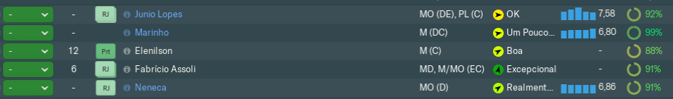 Meias centrais: Embora não pareça tão determinado Mamute é jovem, parece craque para uma Série C e pelo menos por enquanto largou bem. Em ascensão na carreira o jovem Bernardo é titular absoluto por enquanto. Embora pouco ambicioso e determinado, mesmo assim trouxemos emprestado mais uma vez o jovem Marinho. No momento Marinho é primeira opção de reserva no 4231 ou 4141 e titular na trinca com Bernardo e Mamute se optarmos pelo 433. Trazido apenas para completar elenco e sem dúvida para a reserva Elenilson, ex-Sergipe a depender do que apresentou no ex-clube é uma incógnita. Buscamos por que estava livre e para completar grupo
