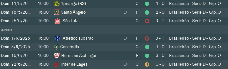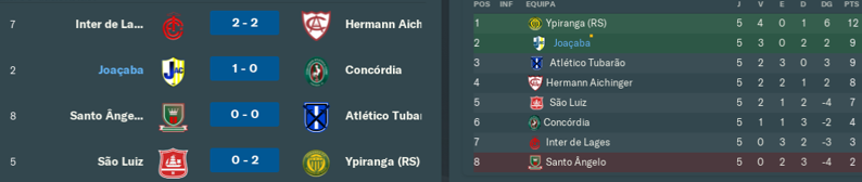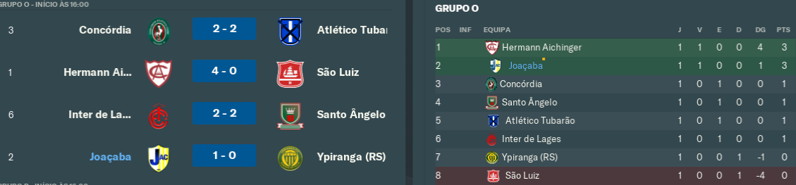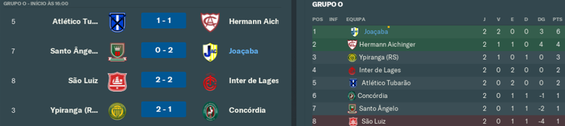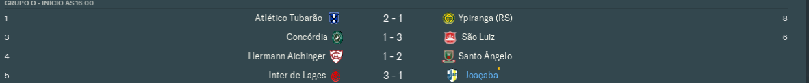 Ypiranga-RS I Santo Ângelo I São Luis I Atlético Tubarão I Inter de Lages (Copa SC) I Concórdia Atlético de Ibirama