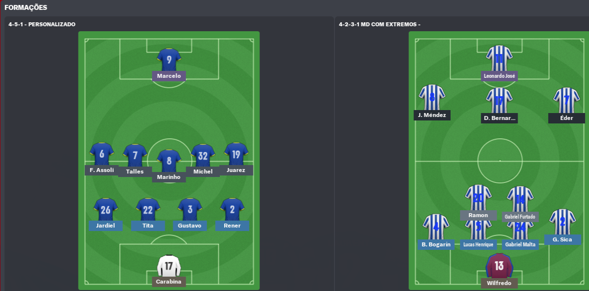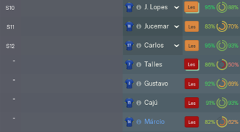 Pontas esquerdas:Soberano nas ultimas 3 temporadas, e com impressionante qualidade no cruzamento e em atributos físicos, Jucemar por enquanto é o dono da ponta esquerda; mas o muito polivalente Fabrício Assoli foi contratado pelo fato de fazer 5 posições  no meio campo, o que me auda na ideia de usar uma terceira tática: o 4-4-2 com linhas baixas.