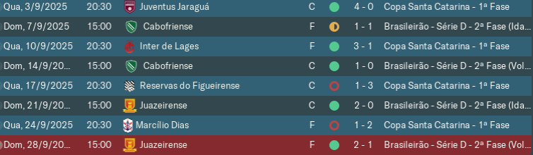 Juventus de Jaraguá I Cabofriense (F) I Inter de Lages I Cabofriense (C) I Figueirense B I Juazeirense (C) I Marcílio Dias I Juazeirense (F)
