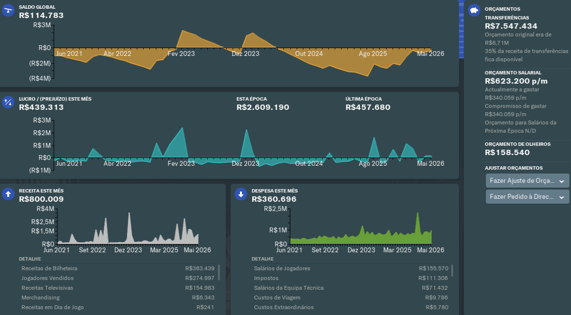 Por fim como as finanças melhoraram pedi ampliação do estadio (queria dobrasse para uns 4mil a capacidade que hoje é de 2375 pessoas sendo pouco mais de 500 sentados) mas o presidente acha que temos poucos sócios ainda (apenas 666). Muito insisti mas em vão. Com as duas vendas em quase meio milhao, algumas reduçoes salariais, e mais os prêmios obtidos nossas finanças finalmente entraram no azul após anos e anos e anos no vermelho. Acho que pela primeira vez desde que assumi embora a projeção continue bem pessimista ainda.