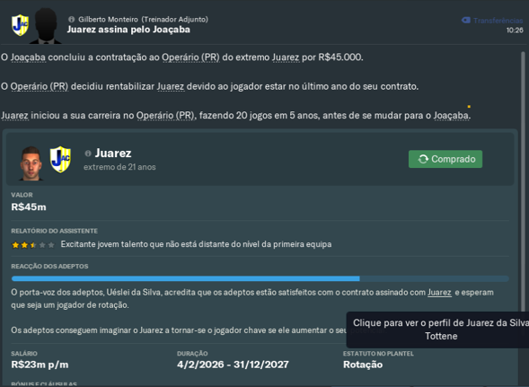 ***Contudo ainda procuramos alguém que tenha boa familiaridade para Medio Direita. E nosso principal alvo é Juarez, do Operário-PR de Ponta Grossa-PR. Custa de meio milhão a 1 Milhão, mas o Operário parece interessado em vendê-lo. Ele poderia ser MD e reserva MOD....se isso vir a ocorrer, Edigar Junio voltaria a disputar posição na esquerda que é sua origem. Fabricio Assoli viria a ser opção no meio campo e alguém poderia sobrar no meio campo. Hoje o candidato a sobrar seria Elenilson.