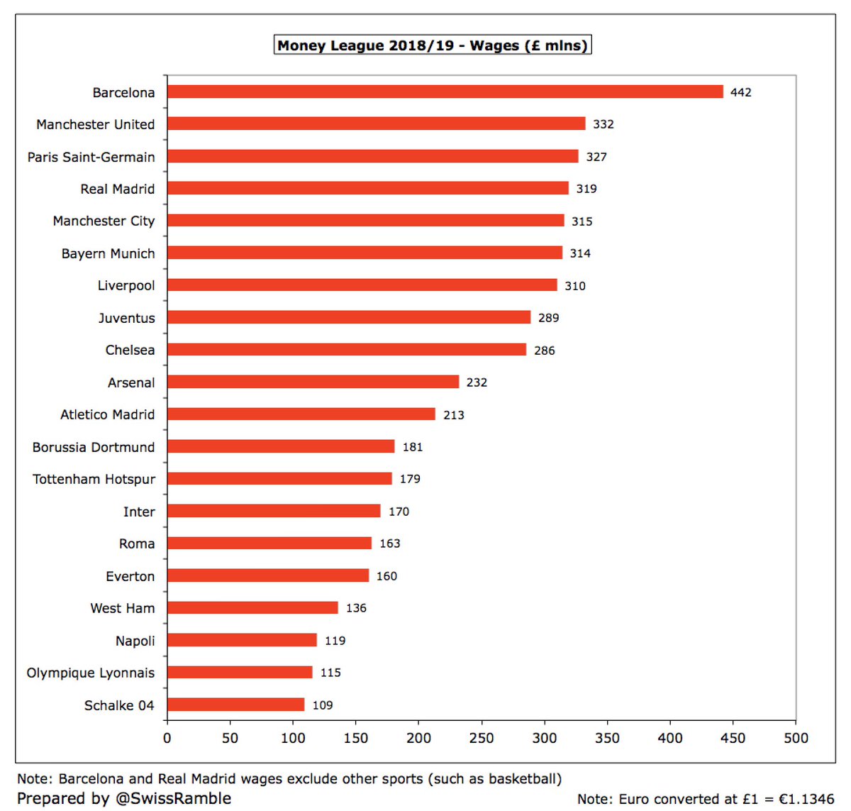 Tava ontem no Twitter e vi uma sequência falando sobre as finanças dos grandes europeus. Achei legal trazer a parte de salários pra cá. São dados um pouco diferentes dos que já tem no tópico - seja por diferenças no que conta como salário, seja porque aqui tá contando o valor total do gasto (em vez da média dos "first team players").