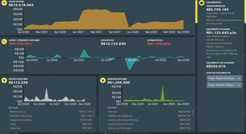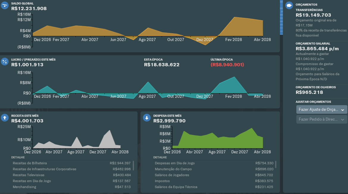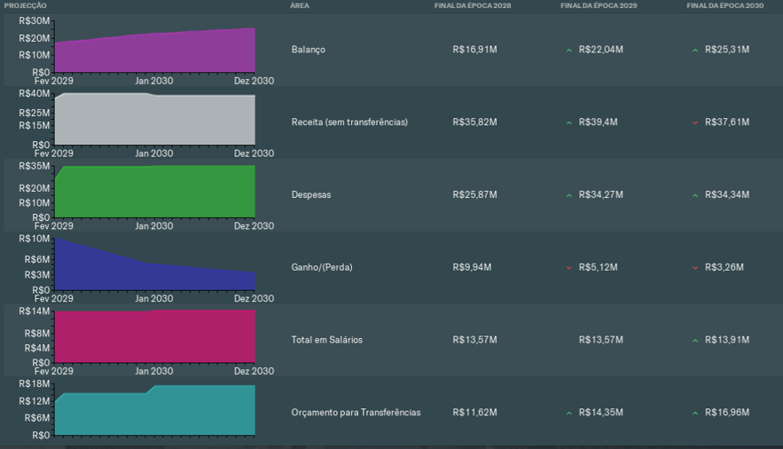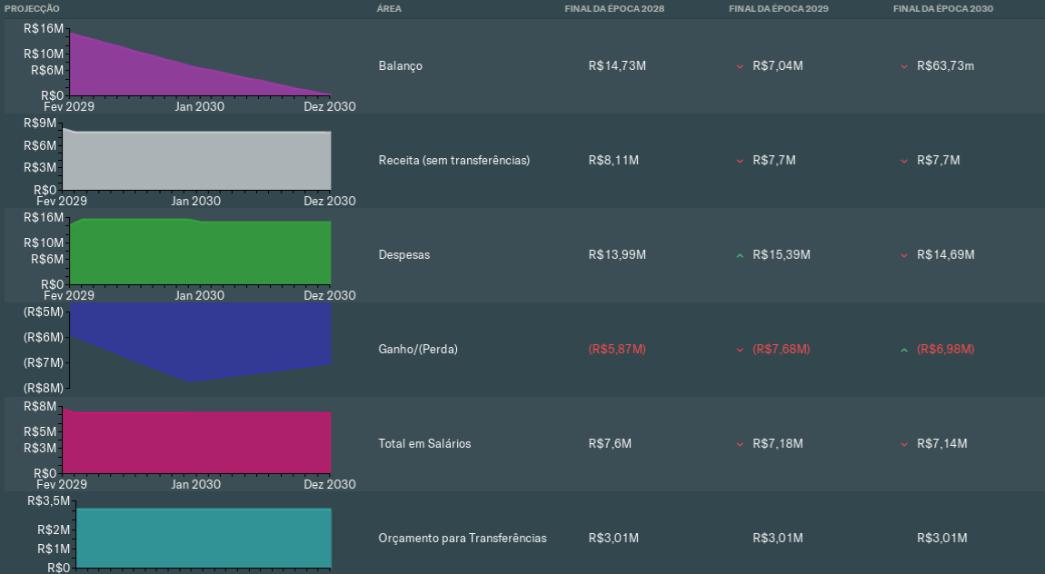 De consolação deixo como legado uma equipe renovada e com a gestão financeira melhorada, bem positiva no momento mas mesmo assim projeção futura muito ruim mostrando a pouca rentabilidade nacional e a alta dependência de torneios como Libertadores, venda de atletas ou necessidade de apostar na base. Como o objetivo meu não é dar atenção tanta a base aliado a más atuações e campanhas desisti desse projeto!