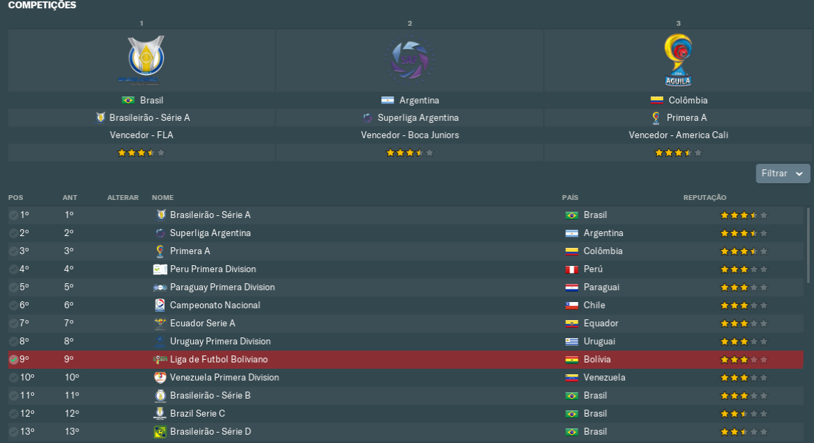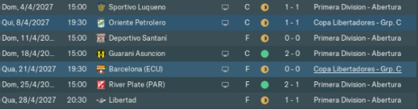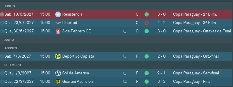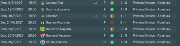 Obrigado pela contribuição @ElPerroMG. É, as vezes as coisas não dão certo mesmo, encontrei uma geração muito fraca no Cerro, tanto técnica quanto mental que compensava no fisico um pouco . Houve alguns destaques como Oscar Britez numa da pontas. O atacante também era bom, mas é complicado fazer frente aos demais times sul-americanos. Me surpreendeu essa geração ser mais fraca que a de times bolivianos. Para o  nível nacional passava por que os demais são ainda mais fracos então polarizava com Olimpia, Guarani, Libertad e Nacional (nessa ordem), porém o Olimpia anda muito rico e forte ao que parece aqui. Consegui o objetivo nacional e sai....por que o continental iria levar muitos anos. Peguei uma época de vaca magra no Cerro (pouca plata $$$ rs rs). Quanto ao Racing eu já esperava  no máximo uma sul-americana pois o time é pequeno, e fui ali apenas para constar mais um no curriculo e não ficar parado até o fim do ano ja que os grandes não me chamaram. Quanto as regras de inscrição de estrangeiros é bem limitada como em quase todos países latinos é uns 3 ou 4 no Paraguai e uns 6 no Uruguai (ou o contrário?) algo assim afinal. E ah! Ainda pretendo retornar ao Uruguai para um dos grandes um dia, mas só depois de rodar toda América do Sul ....então vai demorar!