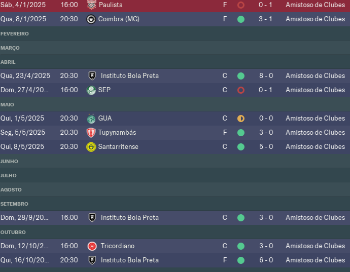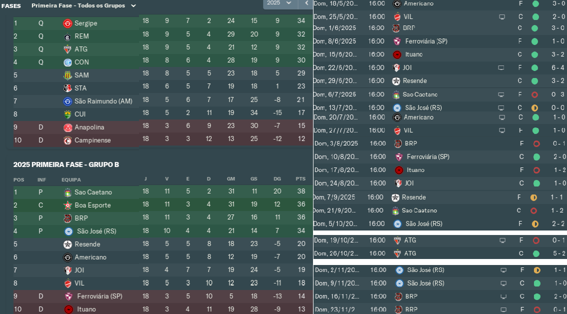 A Série C de 2025 foi um campeonato incrível. Após a grande campanha estadual e os reforços trazidos para o elenco sempre estávamos junto com o São José-RS entre os favoritos ao título da Série C. O São Caetano, o Ituano e o Brasil de Pelotas foram outras equipes a nos dar trabalho. Embalado pela boa fase e o bom trabalho da preparação física, de treinos e observação o elenco começou uma campanha avassaladora no turno (apesar de ser necessário muita cobrança de vstiário para virar o jogo em três ocasiões, e entrando em declínio no final deste e fazendo um returno bastante aquém se comparado ao turno. Tão ruim que tive implantar um "estilo Felipão/Muricy" e meter muita bronca na equipe durante a temporada. Por soerte a equipe apenas perdeu a liderança da chave. Porém os 4 classificados da nossa chave eram tão fortes, tão fortes em relação a todos demais clubes que os 4 promovidos foram justamente os 4 classificados do nosso grupo, não sendo promovido nenhum clube da outra Chave.