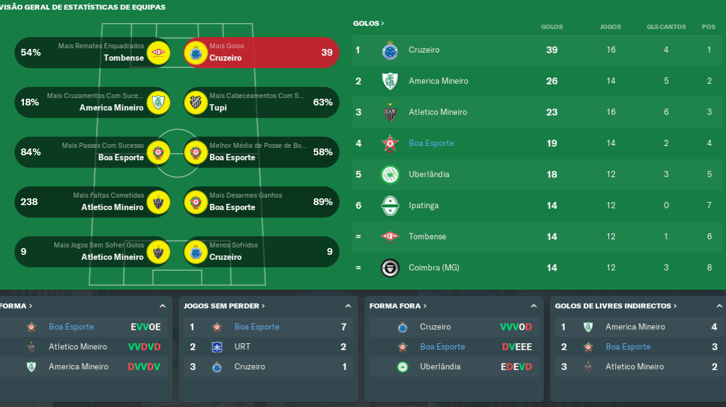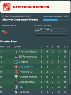 Por fim disputaríamos a Taça Minas Gerais. Campeonato que não é difícil pelos reforços que trazemos, mas de bom nível técnico e ainda um tanto desafiador para nosso atual momento. Iniciamos a disputa com reservas porém a derrota inesperada de 2x1 para a URT me fez obrigar a usar os titulares contra o Social. O jogo foi fraco mas passamos em segundo lugar. Nas fase de mata-mata usando titulares na ida e reservas na volta chegamos a final contra a mesma URT