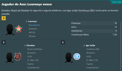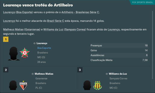 Prêmios individuais Série C : Artilheiro: Lourenço (28) Boa Esporte, ponta direita = 14 gols